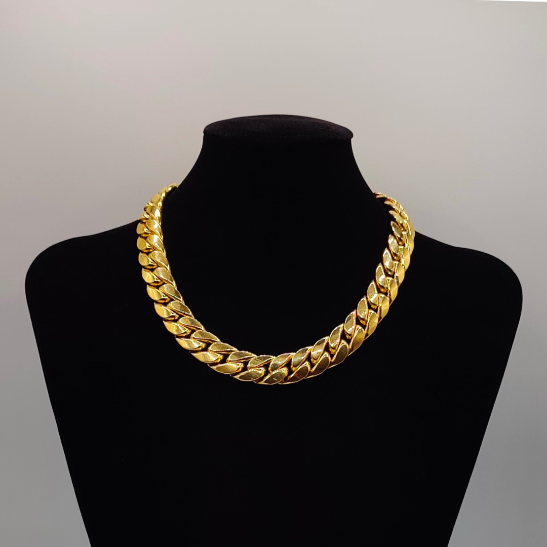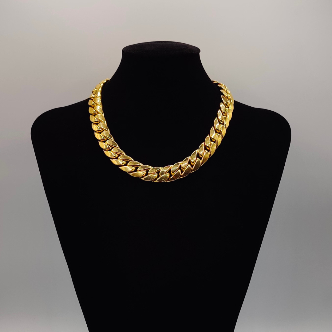 Realza tu estilo con esta elegante cadena cubana, meticulosamente fabricada en oro de 18 quilates. Con un diseño clásico y sofisticado, esta cadena cuenta con eslabones anchos de 15 mm que añaden un toque de opulencia y presencia a cualquier atuendo. Su longitud de 40 cm es perfecta para llevarla sola o con un colgante, adaptándose a cualquier ocasión.