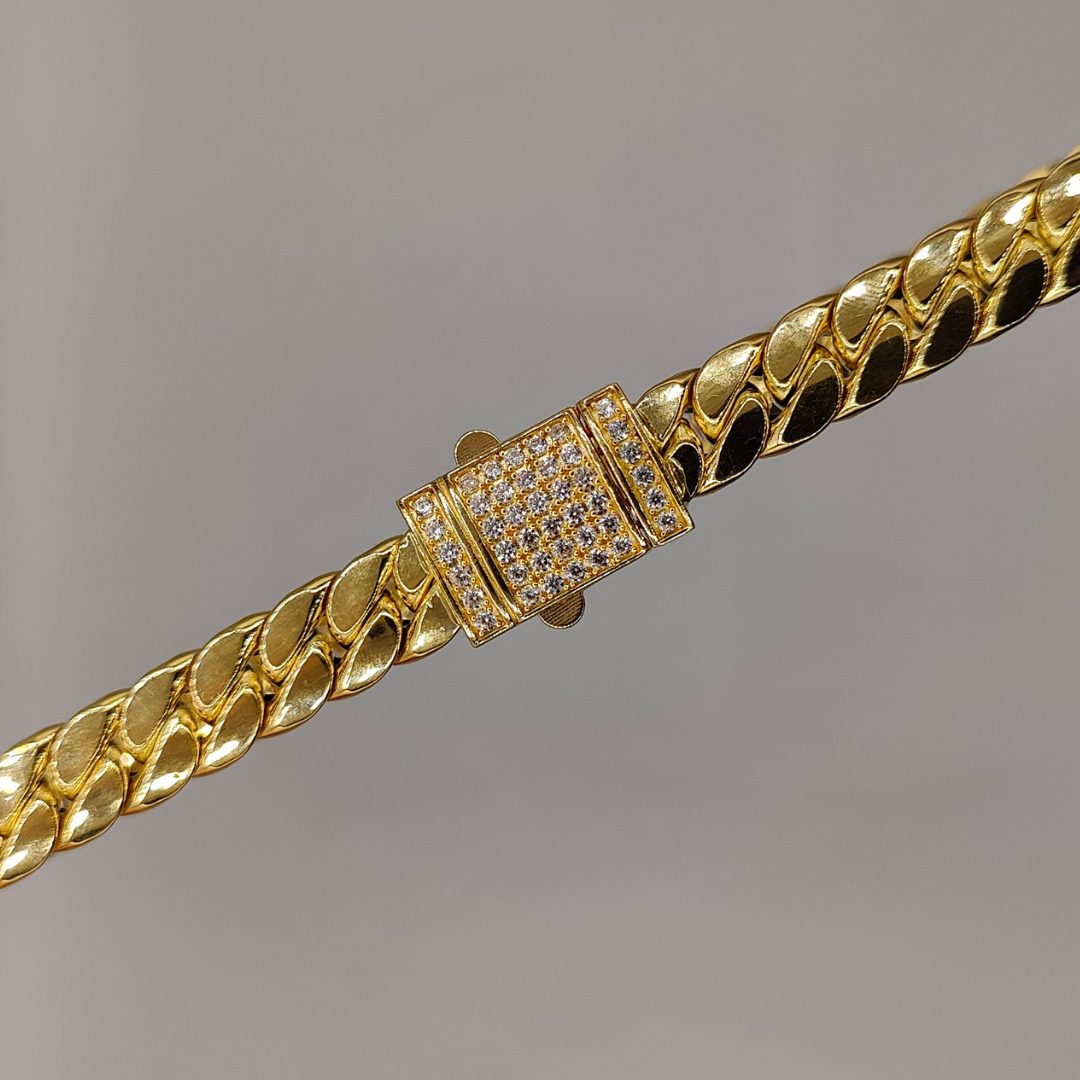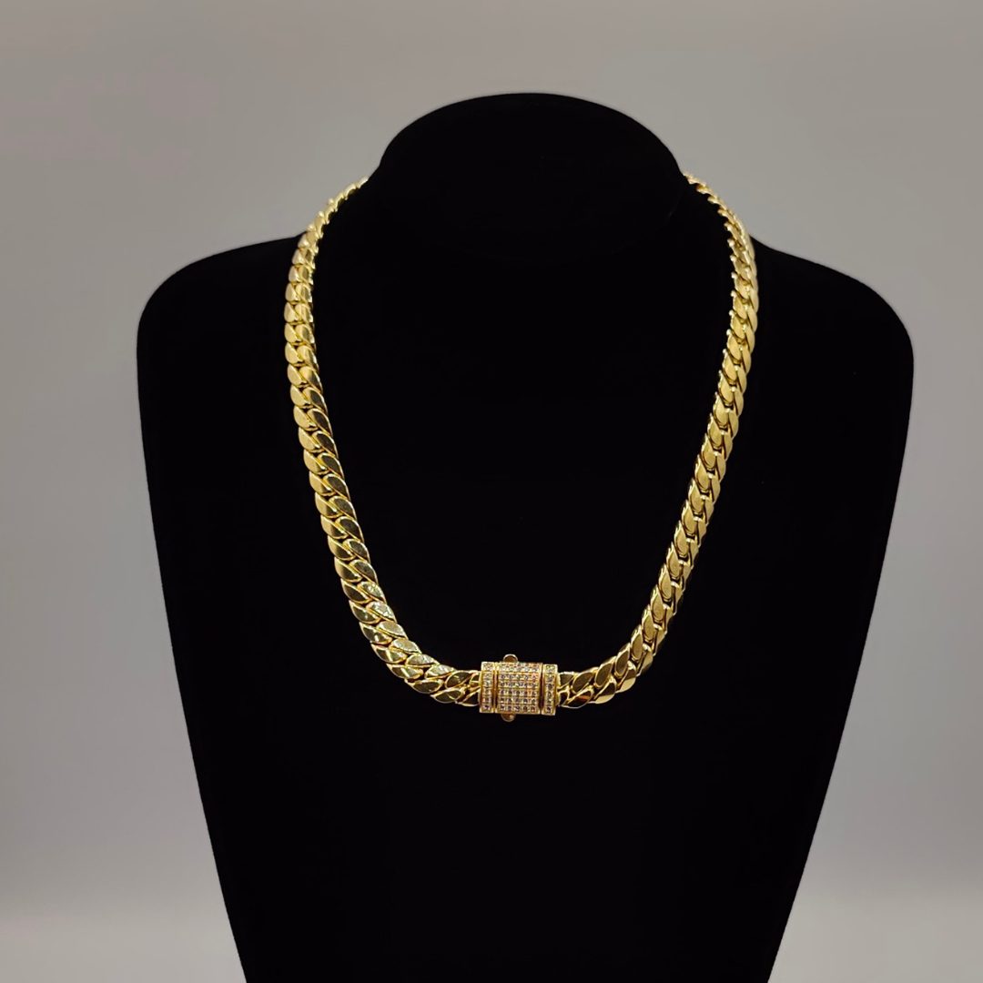 El toque de lujo lo aporta su exclusivo cierre adornado con circonitas, que añade un brillo cautivador y un detalle distintivo. Ideal para complementar cualquier estilo, ya sea en eventos especiales o como parte de tu look diario, esta cadena combina a la perfección la fuerza de su diseño con la delicadeza de los detalles. Esta cadena cubana es más que un accesorio, es una declaración de estilo y personalidad. ¡Hazla tuya hoy y luce una joya que marca la diferencia! Lleva contigo una joya que irradia lujo y elegancia en cada detalle. ¡Un complemento imprescindible para realzar tu look y tu colección de joyas!