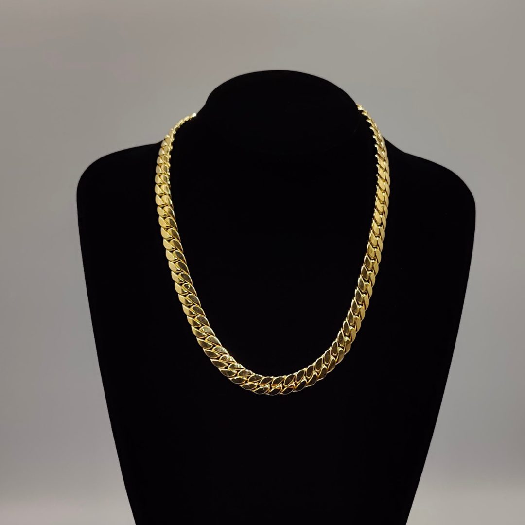 Imponente y sofisticada, esta cadena cubana de oro 18K es la elección perfecta para quienes buscan un accesorio llamativo y elegante. Con 50 cm de longitud y un ancho de 10 mm.