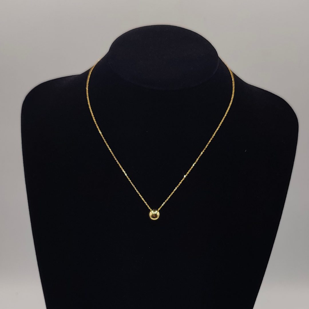 Un diseño sencillo pero lleno de encanto: este collar con cadena rolo en oro de 18 quilates se adorna con un delicado colgante en forma de bola, creando una pieza elegante, minimalista y atemporal. Perfecto para usar a diario o como toque sutil en ocasiones especiales, destaca por su brillo cálido y su sofisticación discreta.
