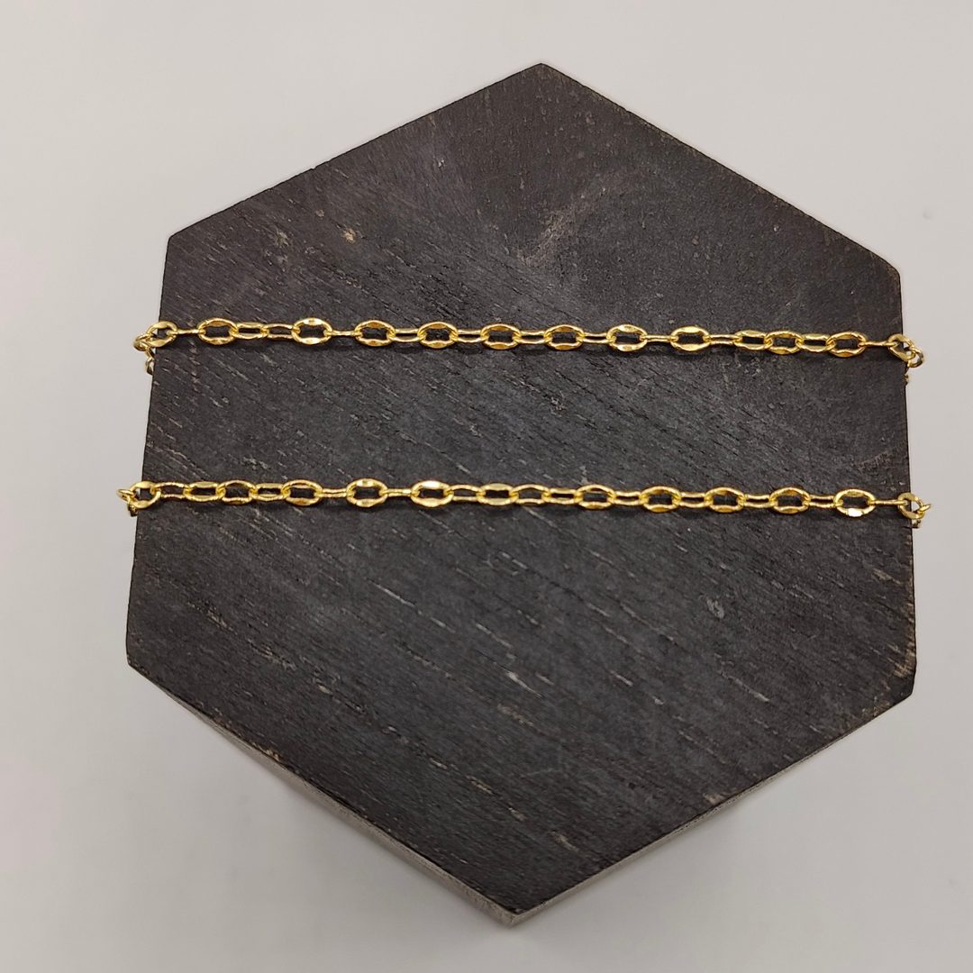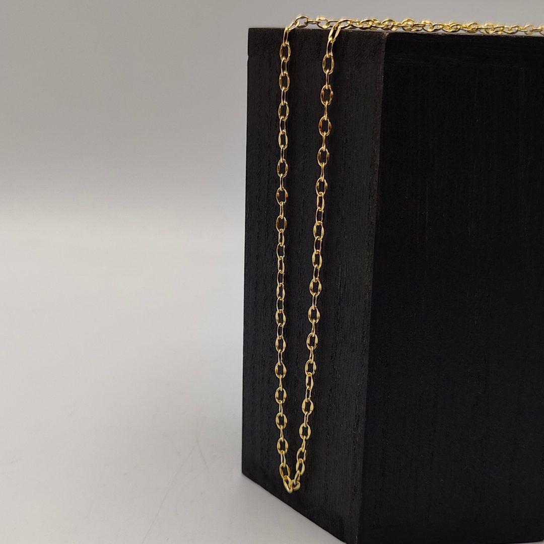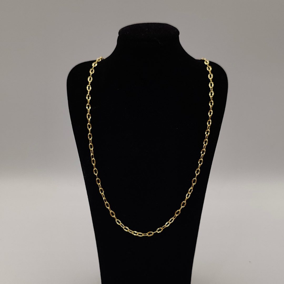 Diseñada con eslabones de 3 mm de grosor, esta pieza combina delicadeza y distinción, perfecta para quienes aprecian la elegancia discreta. Su longitud de 50 cm la hace ideal para lucir sola o como complemento de tus dijes favoritos, adaptándose a cualquier