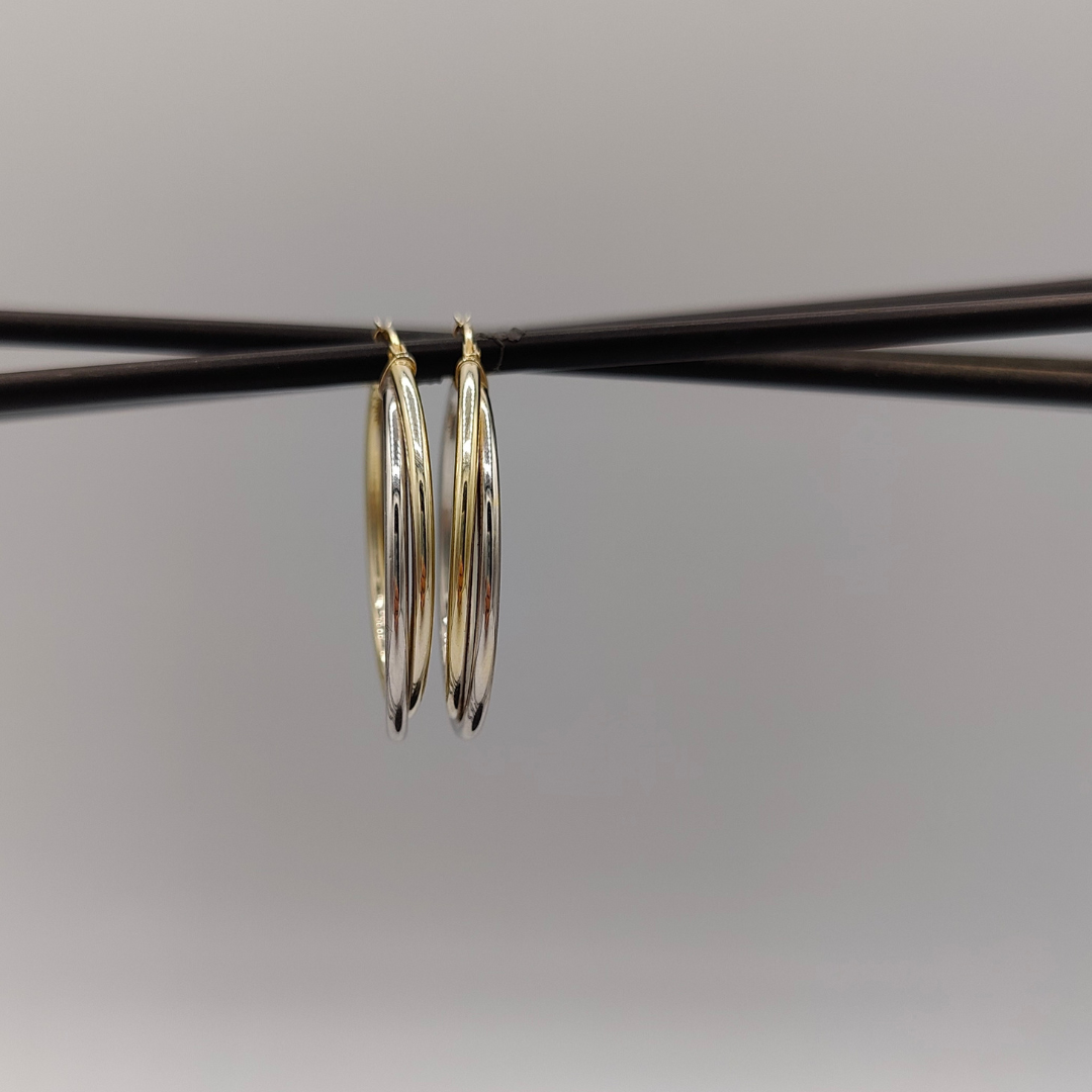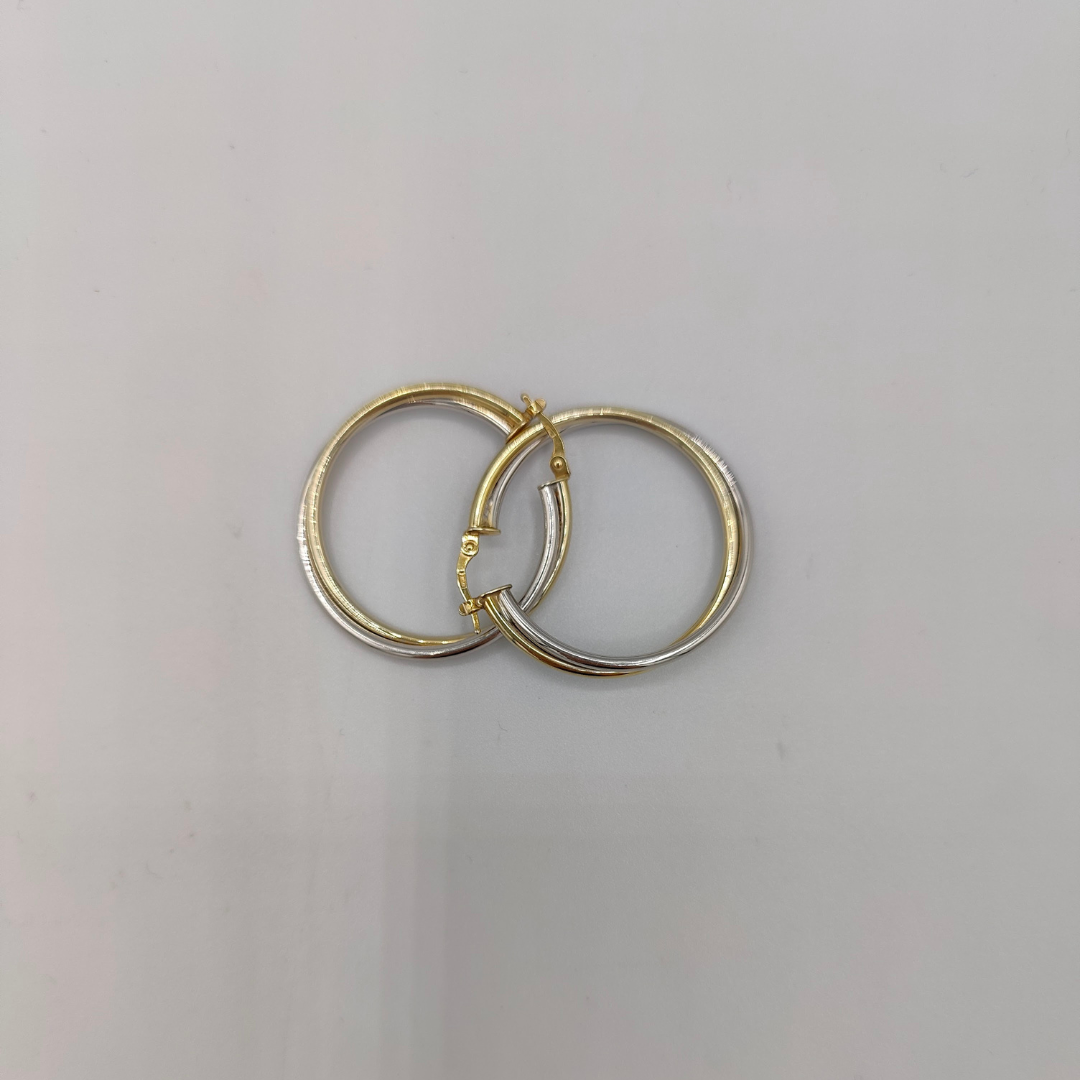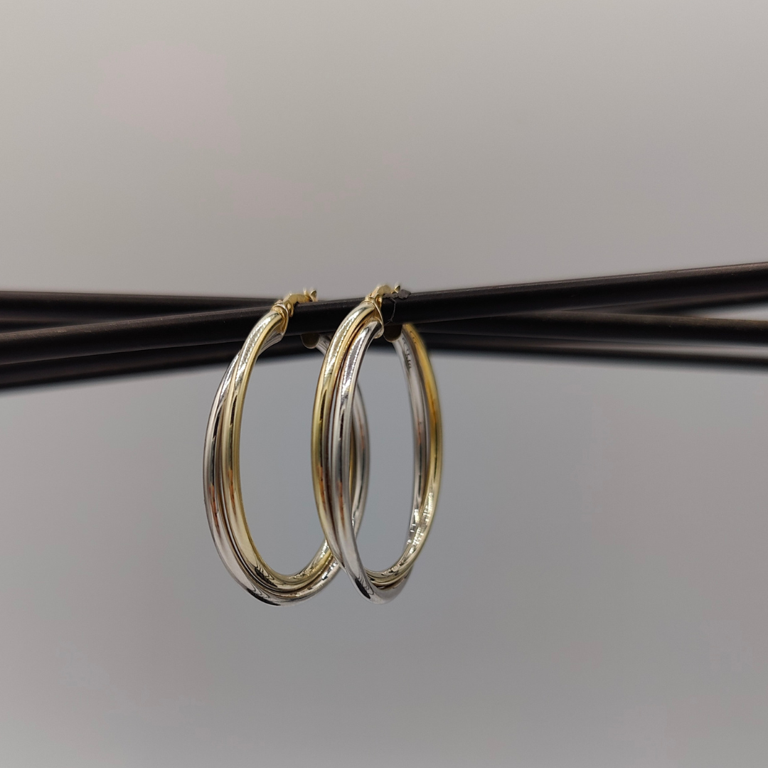 Eleva tu estilo con nuestros deslumbrantes pendientes tipo aro entrelazado. Un par de belleza atemporal, donde el oro y el oro blanco se fusionan en un diseño elegante y sofisticado. Cada aro se entrelaza con gracia creando un aspecto único que atrae todas las miradas. Ya sea para una ocasión especial o para el día a día, estos pendientes con cierre hippy, añaden un toque de lujo a cualquier conjunto.