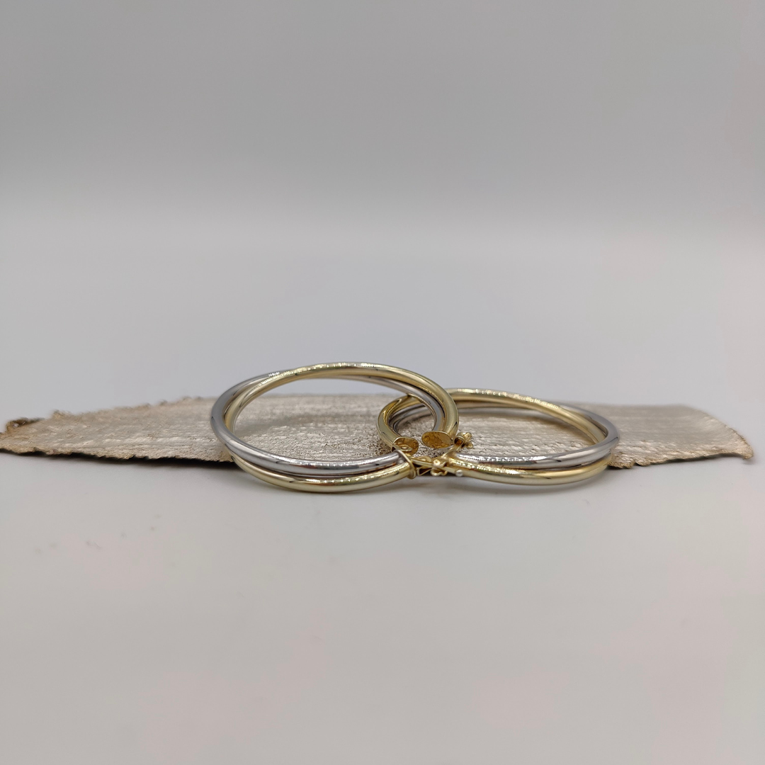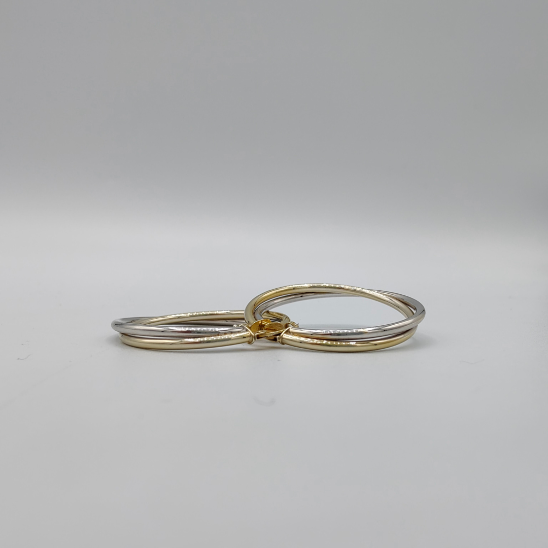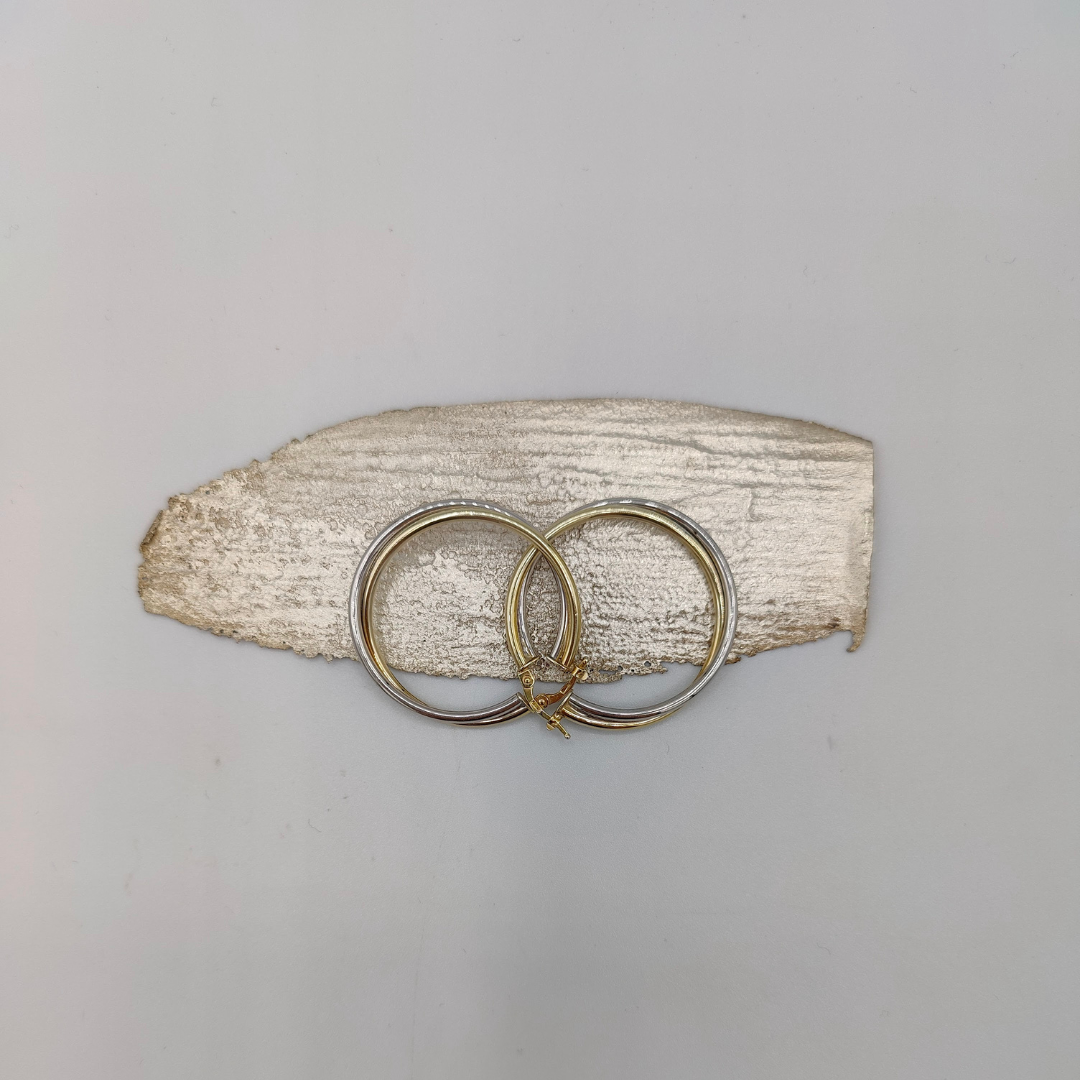 Eleva tu estilo con nuestros deslumbrantes pendientes tipo aro entrelazado. Un par de belleza atemporal, donde el oro y el oro blanco se fusionan en un diseño elegante y sofisticado. Cada aro se entrelaza con gracia creando un aspecto único que atrae todas las miradas. Ya sea para una ocasión especial o para el día a día, estos pendientes con cierre hippy, añaden un toque de lujo a cualquier conjunto.