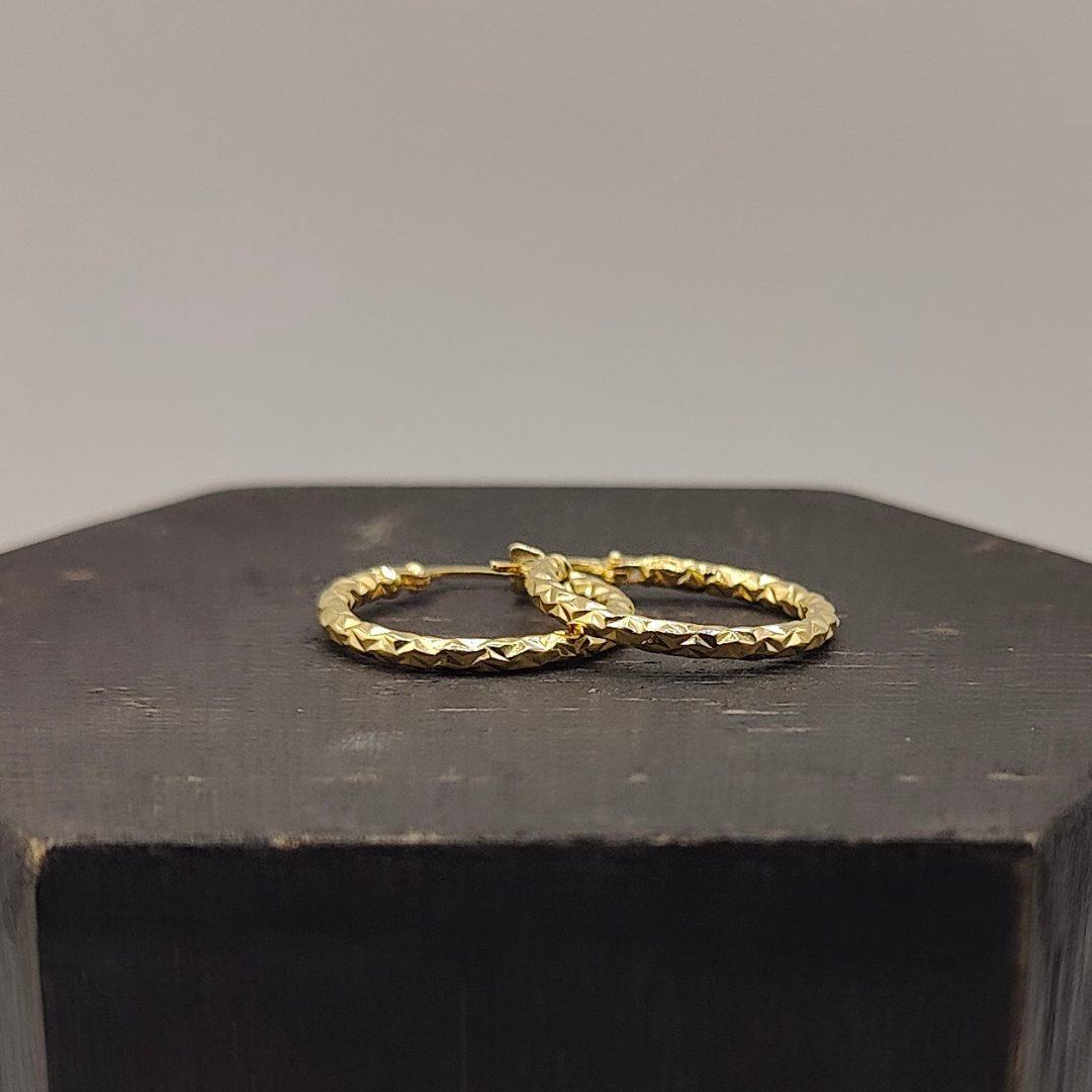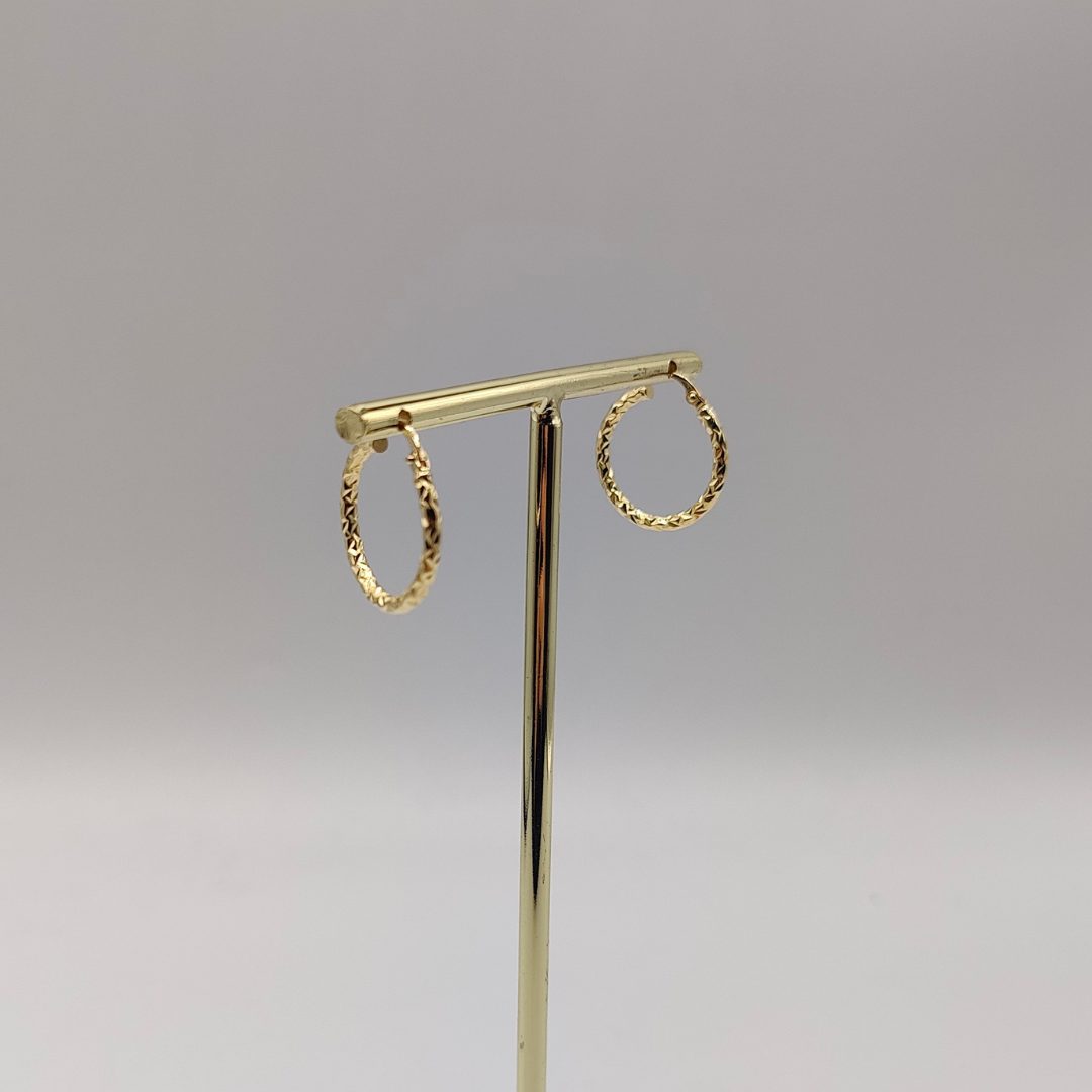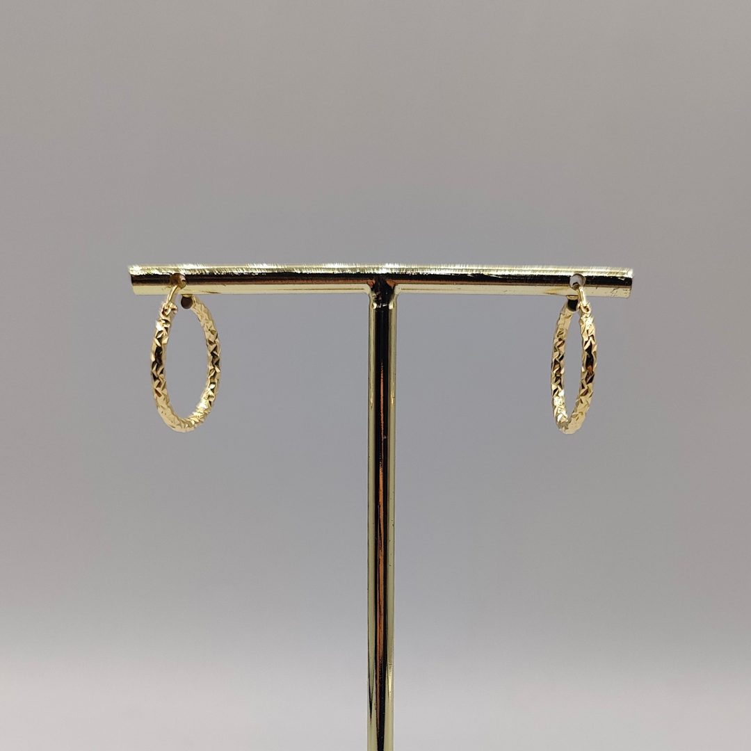 Este elegante pendiente de aro de 2 cm de diámetro y 2 mm de ancho presenta una delicada textura que aporta sofisticación y detalle a tu look. Fabricado en oro de 18K.