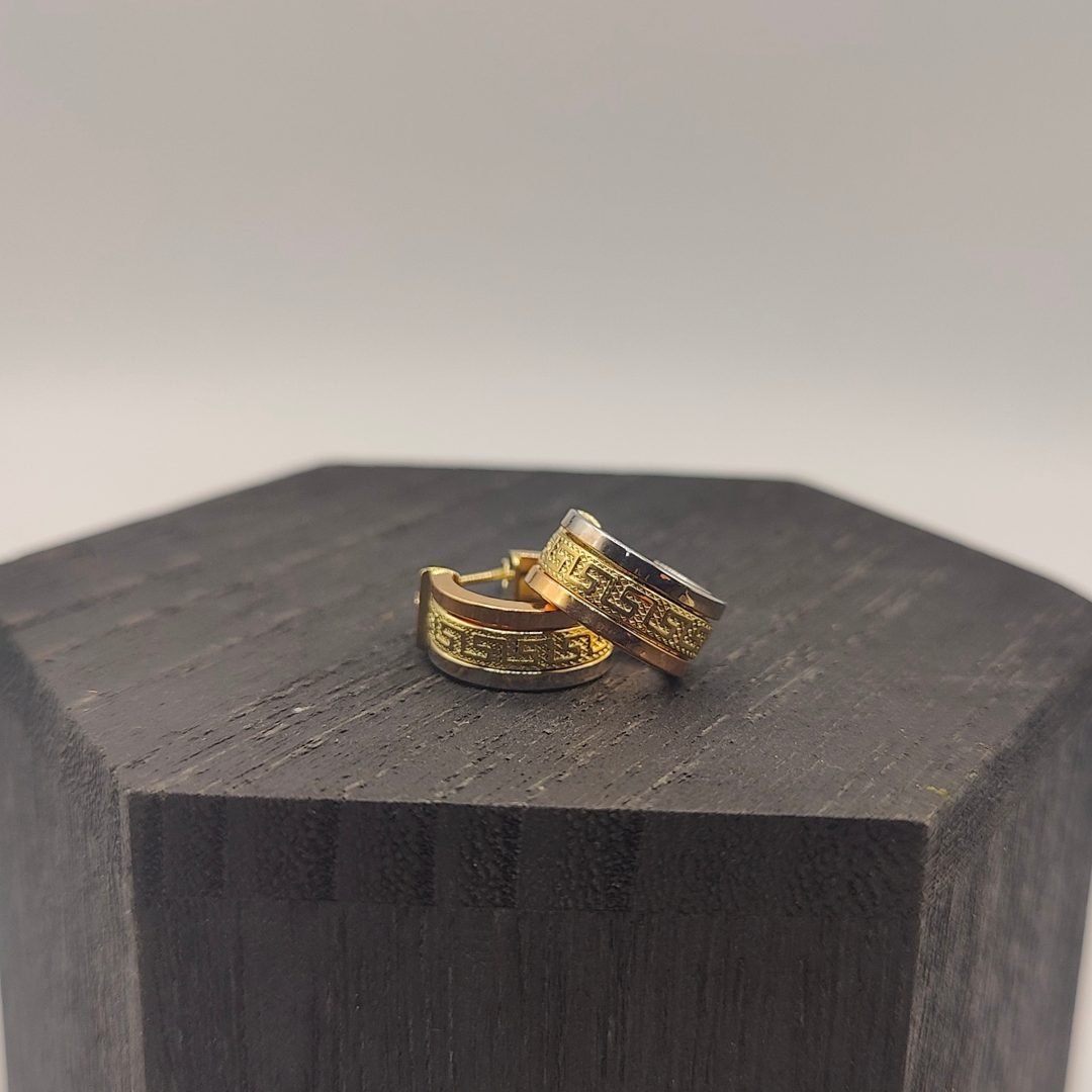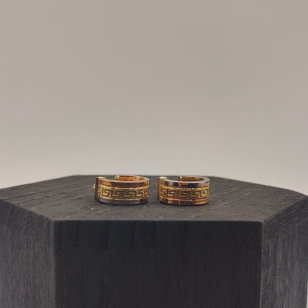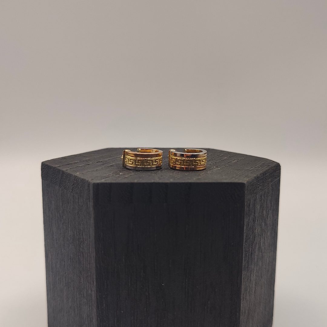 Este sofisticado pendiente de aro, inspirado en el estilo exclusivo de Versace, combina magistralmente dos tonos de oro: dorado y blanco. Con un diámetro de 12 mm
