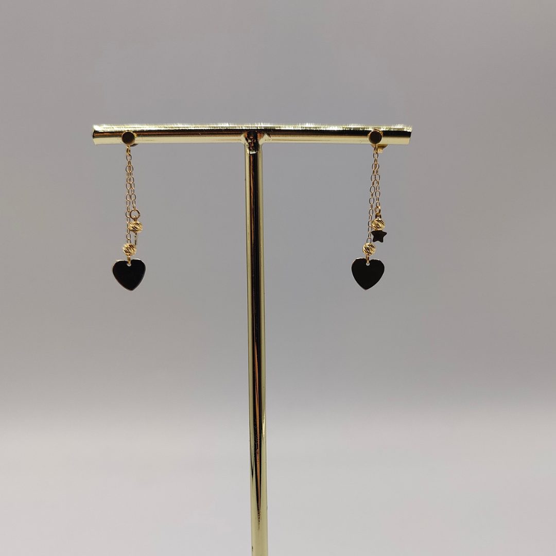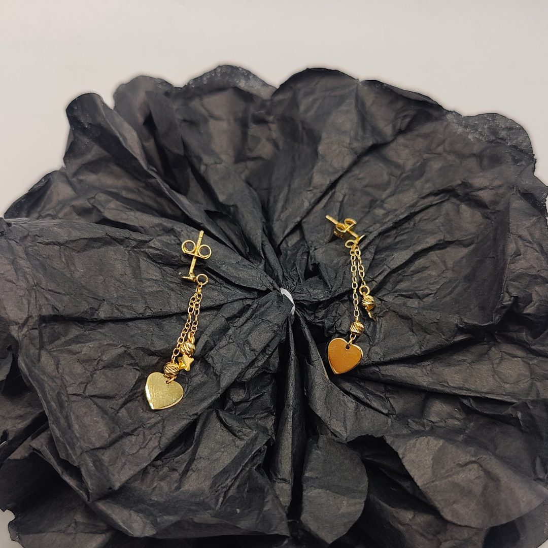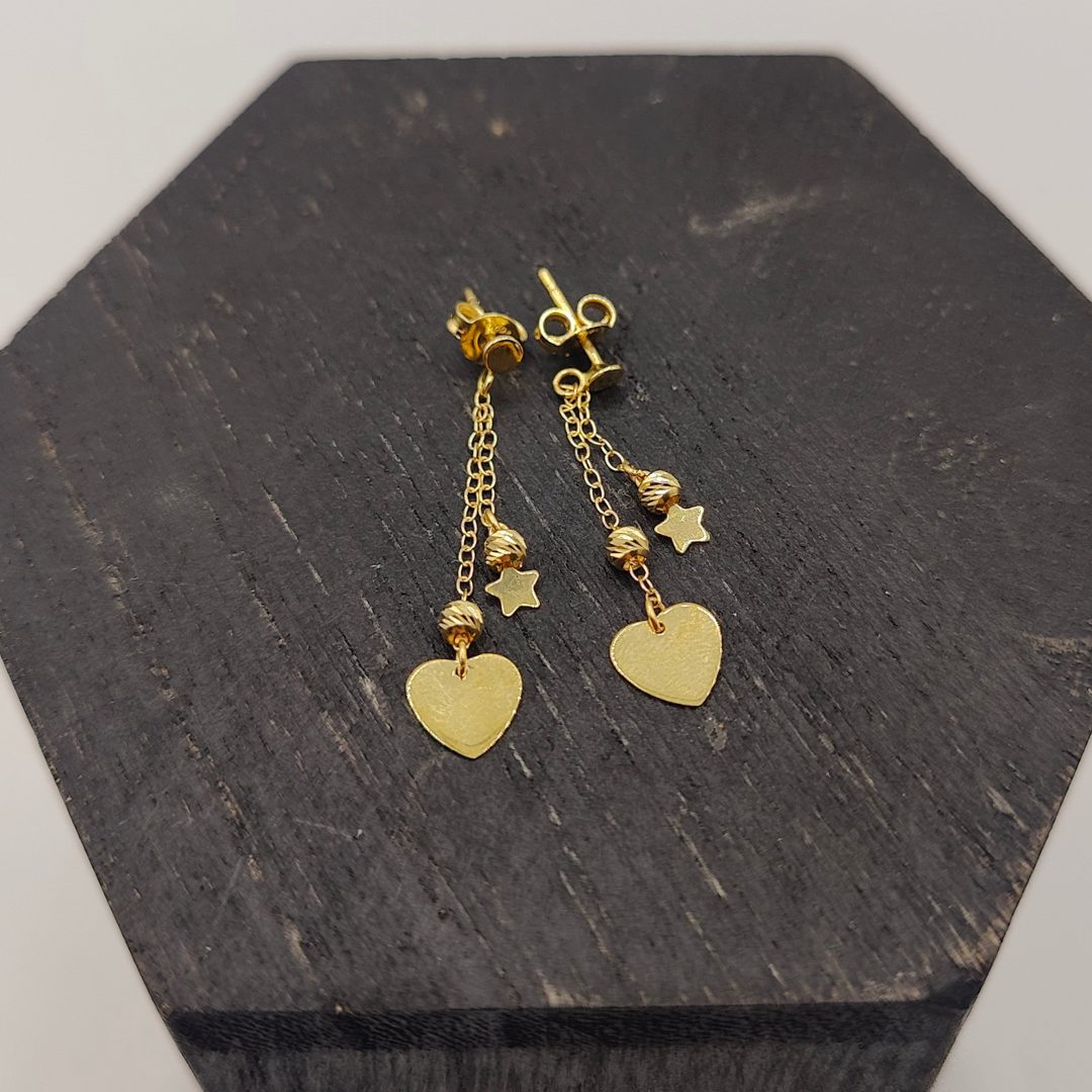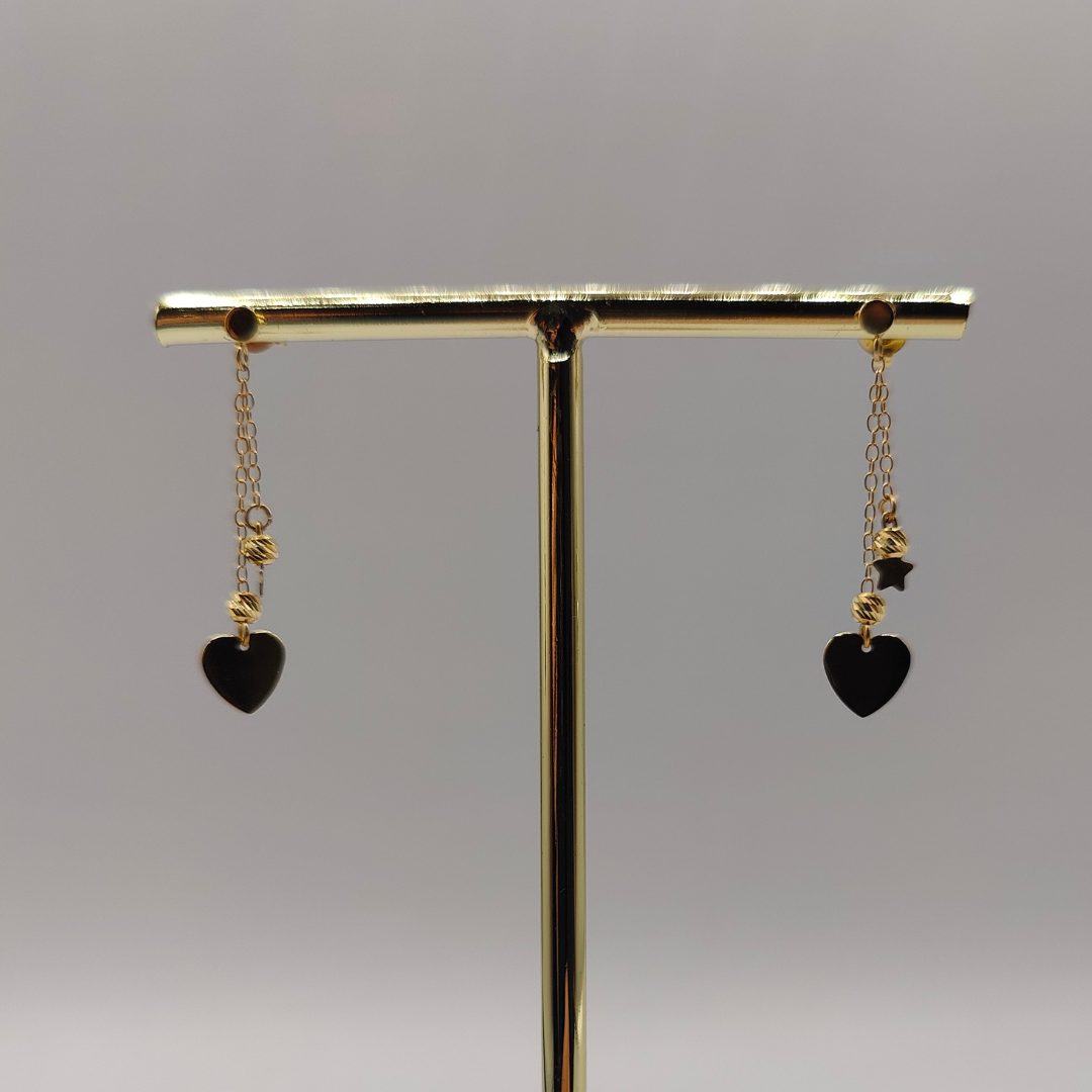 Un diseño encantador que fusiona dos símbolos de belleza: el corazón y la estrella. Estos pendientes colgantes, fabricados en oro de 18K, aportan un toque de romanticismo y magia a tu look. Con un cierre de presión que asegura comodidad y ajuste seguro, son ideales para quienes buscan un accesorio único y sofisticado para cualquier ocasión especial o para el uso diario.