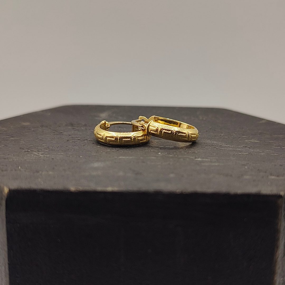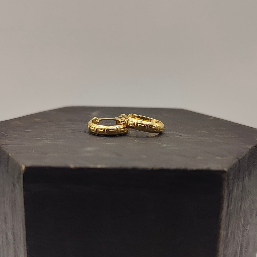 Inspirado en la elegancia clásica, este pendiente de aro de 1,2 cm de diámetro y 3 mm de ancho presenta un diseño sofisticado con el inconfundible estilo Versace. Fabricado en oro de 18K, su acabado refinado lo convierte en una pieza versátil y atemporal. Equipado con cierre hippy para un ajuste cómodo y seguro, es el complemento ideal para quienes buscan un toque de lujo en su día a día.
