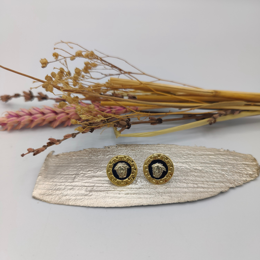 Deslumbra con elegancia nuestros pendientes de oro de 18k. Presentando un diseño circular adornado con el distintivo logo envolviendo la circunferencia y la icónica cara de medusa en el centro. ¡Añade un toque de sofisticación a tu estilo con estos pendientes exquisitamente detallados!
