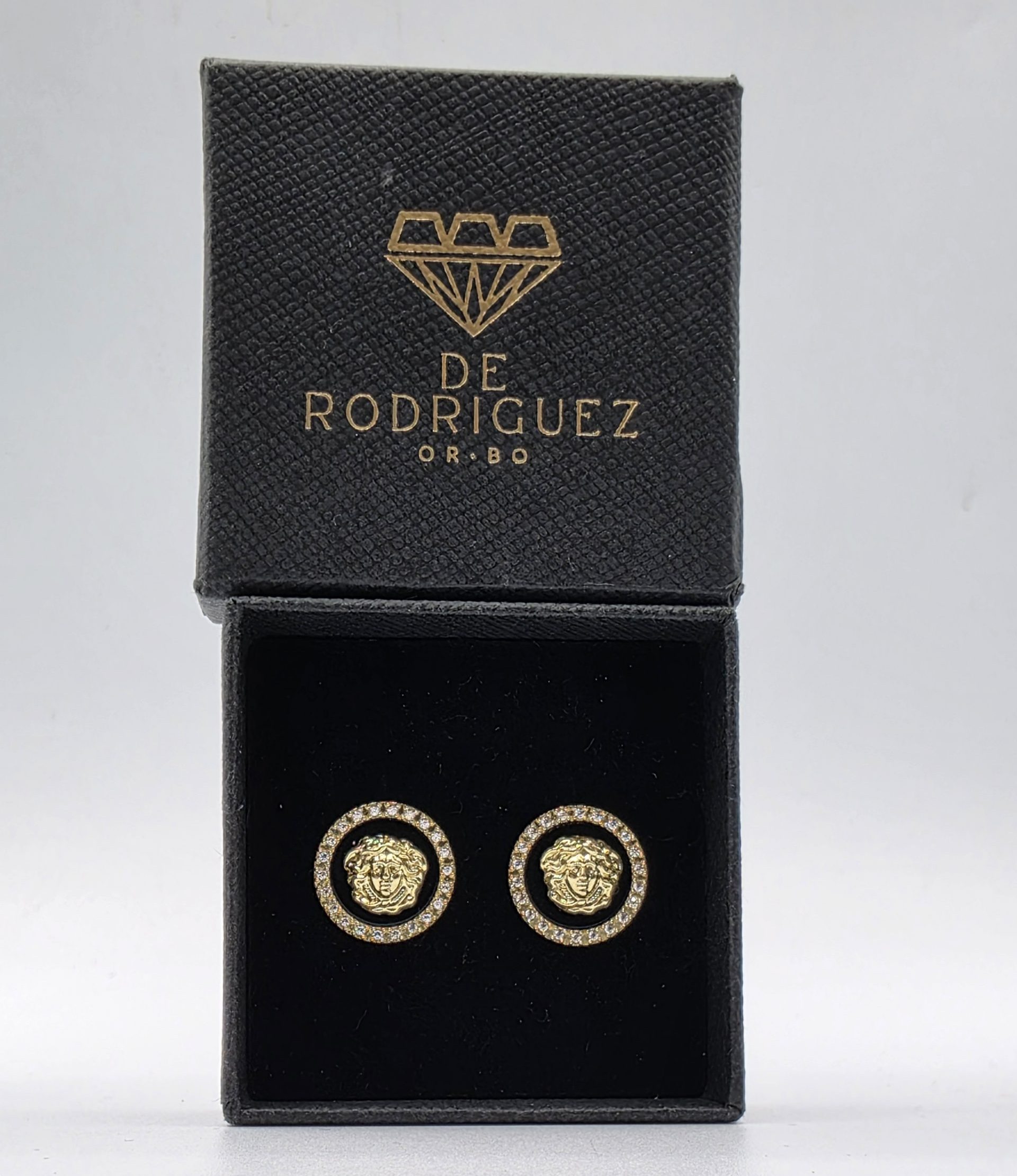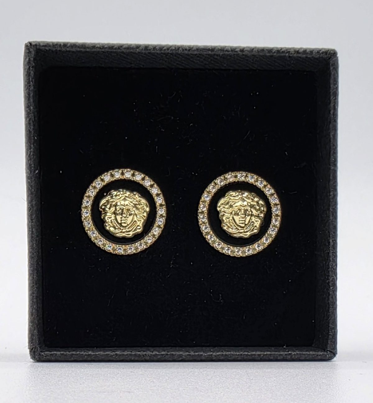 Luce un estilo elegante y atrevido con este pendiente redondo de oro 18K, decorado con esmalte de alta calidad y un espectacular diseño de la cara de Medusa en el centro. Su borde está finamente engastado con circonitas brillantes, que aportan un toque de lujo y luminosidad.