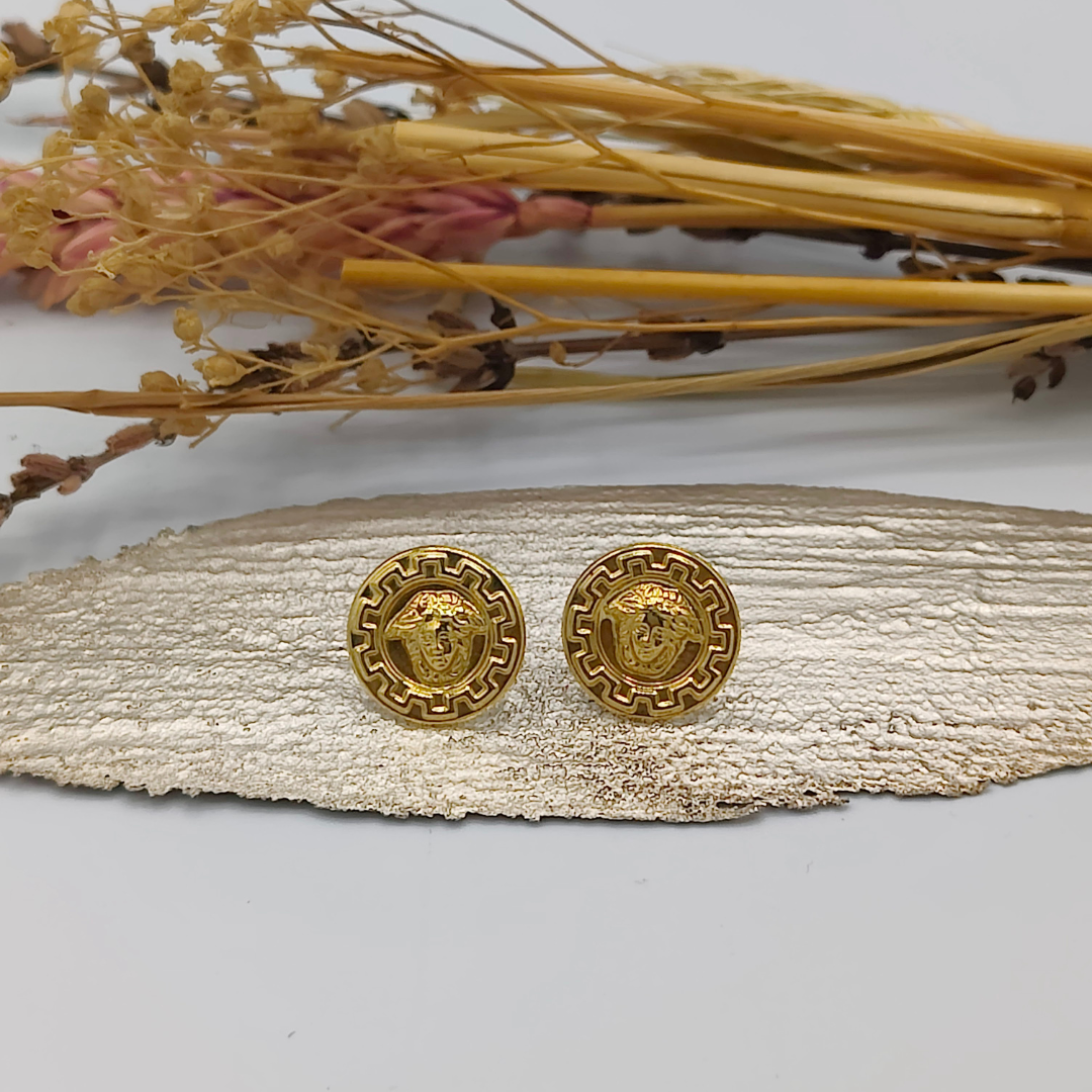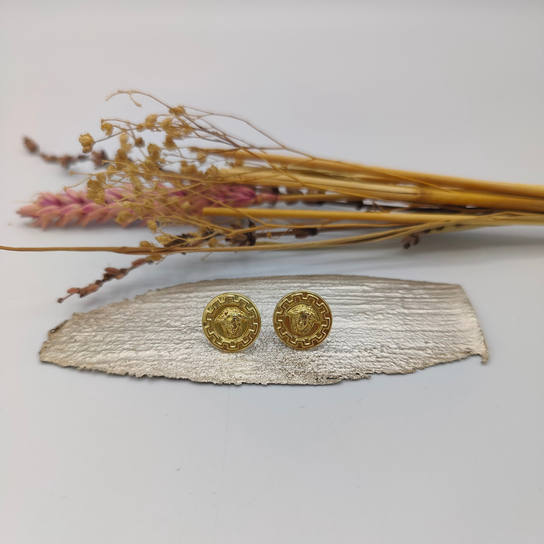 Deslumbra con elegancia nuestros pendientes de oro de 18k. Presentando un diseño circular adornado con el distintivo logo envolviendo la circunferencia y la icónica cara de medusa en el centro. ¡Añade un toque de sofisticación a tu estilo con estos pendientes exquisitamente detallados!
