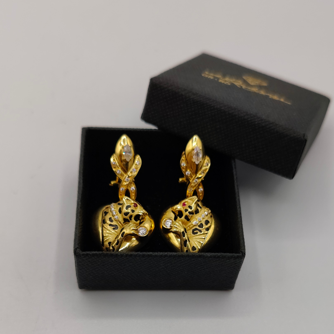 El contraste entre la delicadeza del corazón y la imponente presencia de los leopardos crea una pieza única que destaca por su sofisticación y estilo. Las circonitas, cuidadosamente engastadas, añaden un brillo especial, haciendo de estos pendientes el accesorio perfecto para cualquier ocasión.