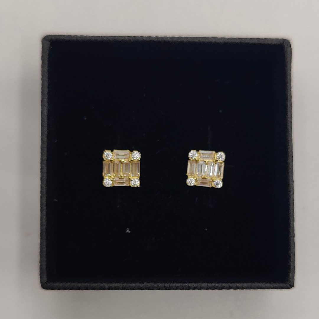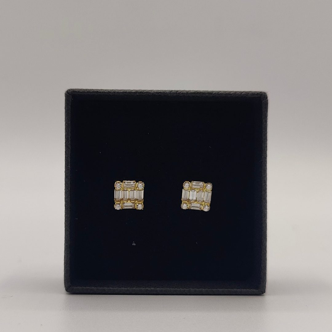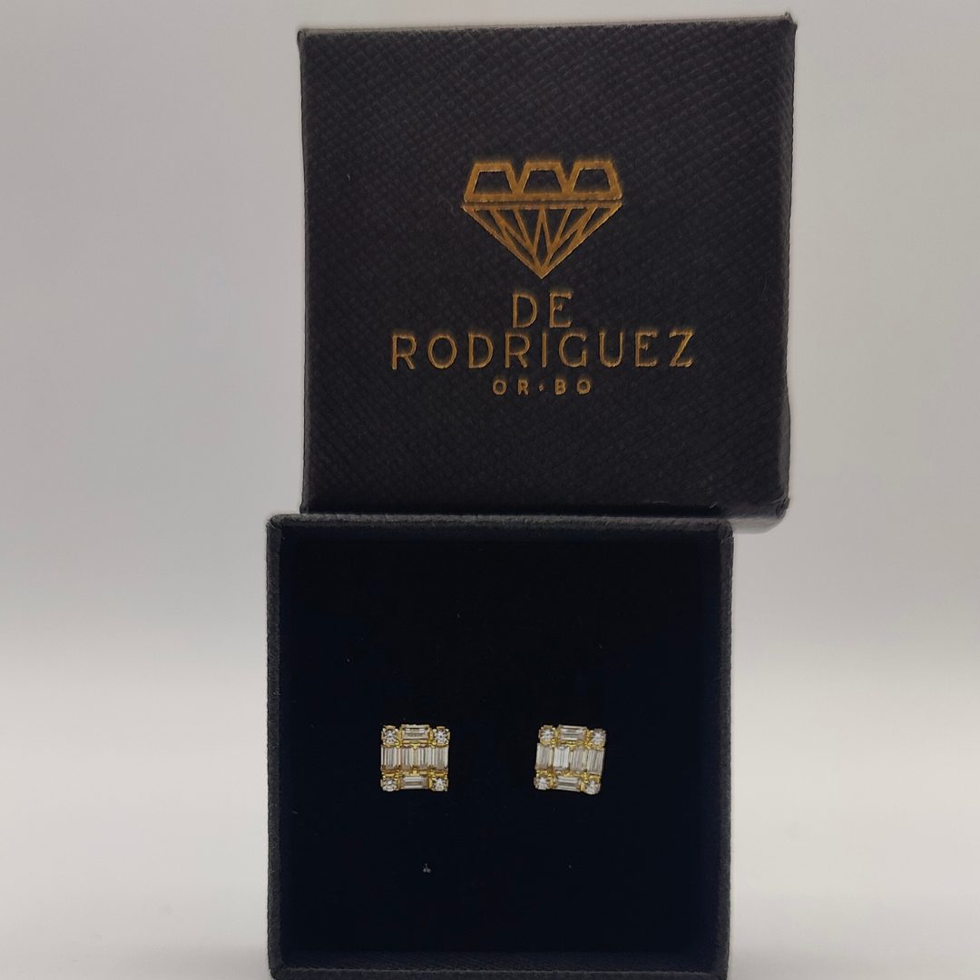 Estos elegantes pendientes presentan un diseño cuadrado atemporal, elaborados en oro de 18 quilates que aporta un brillo cálido y sofisticado. Cada pendiente está adornado con una circonita central de talla baguette, rodeada por un halo de circonitas redondas que realzan su luminosidad. El cierre de presión garantiza comodidad y seguridad durante todo el día.