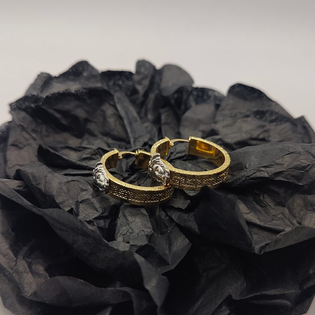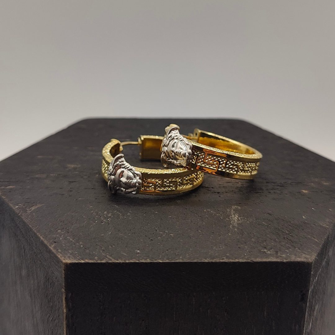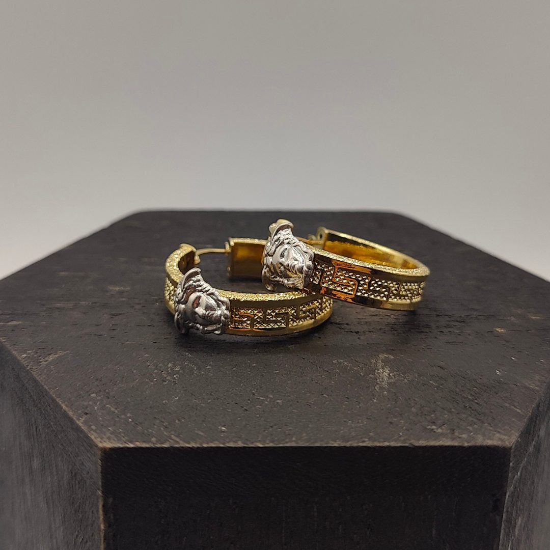 Inspirados en la elegancia atemporal, estos pendientes de aro de 2,5 cm de diámetro y 6 mm de ancho destacan por su acabado brillante y el icónico diseño de meandros en el centro, evocando el estilo inconfundible de Versace. Fabricados en oro de 18K, ofrecen un equilibrio perfecto entre lujo y sofisticación. Su cierre hippy garantiza comodidad y seguridad, convirtiéndolos en la elección ideal para quienes buscan un accesorio distinguido y versátil.