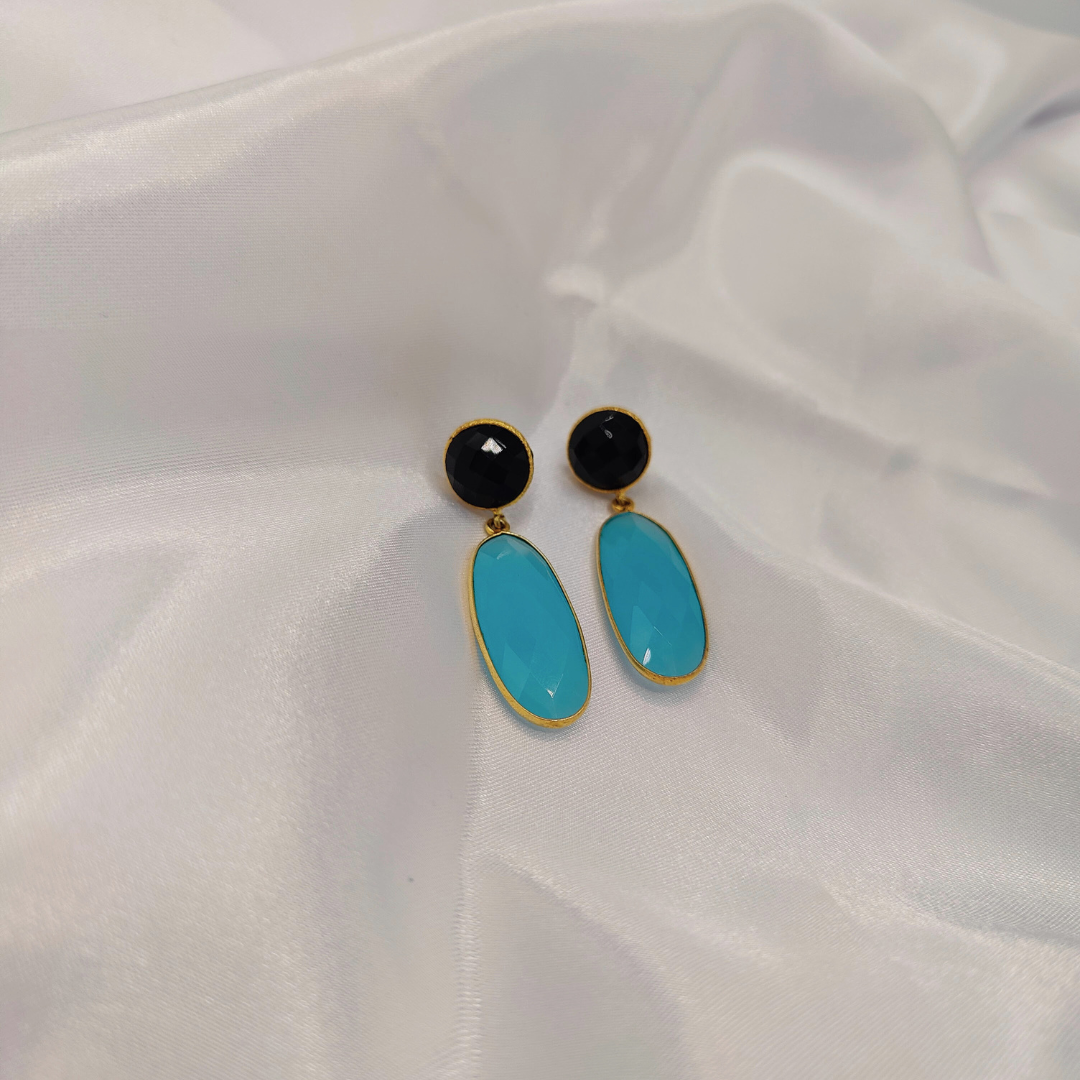 ✨ Añade un toque de elegancia y contraste a tu estilo con estos cautivadores pendientes de plata chapados en oro de 18k. 💫 Con una piedra negra redonda como punto focal y un óvalo de piedra calcedonia colgando