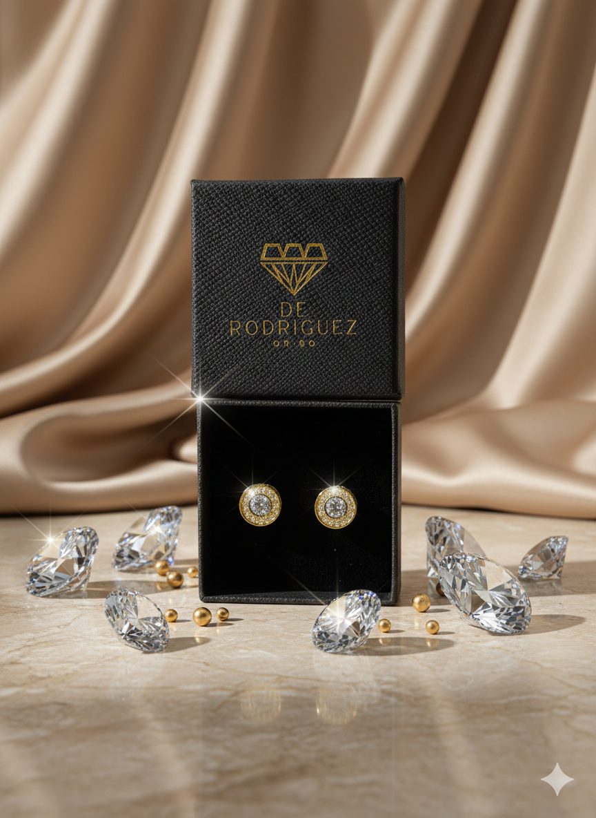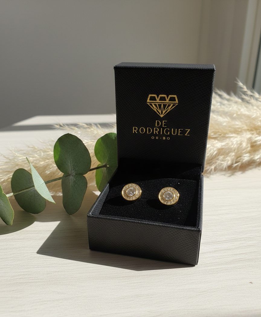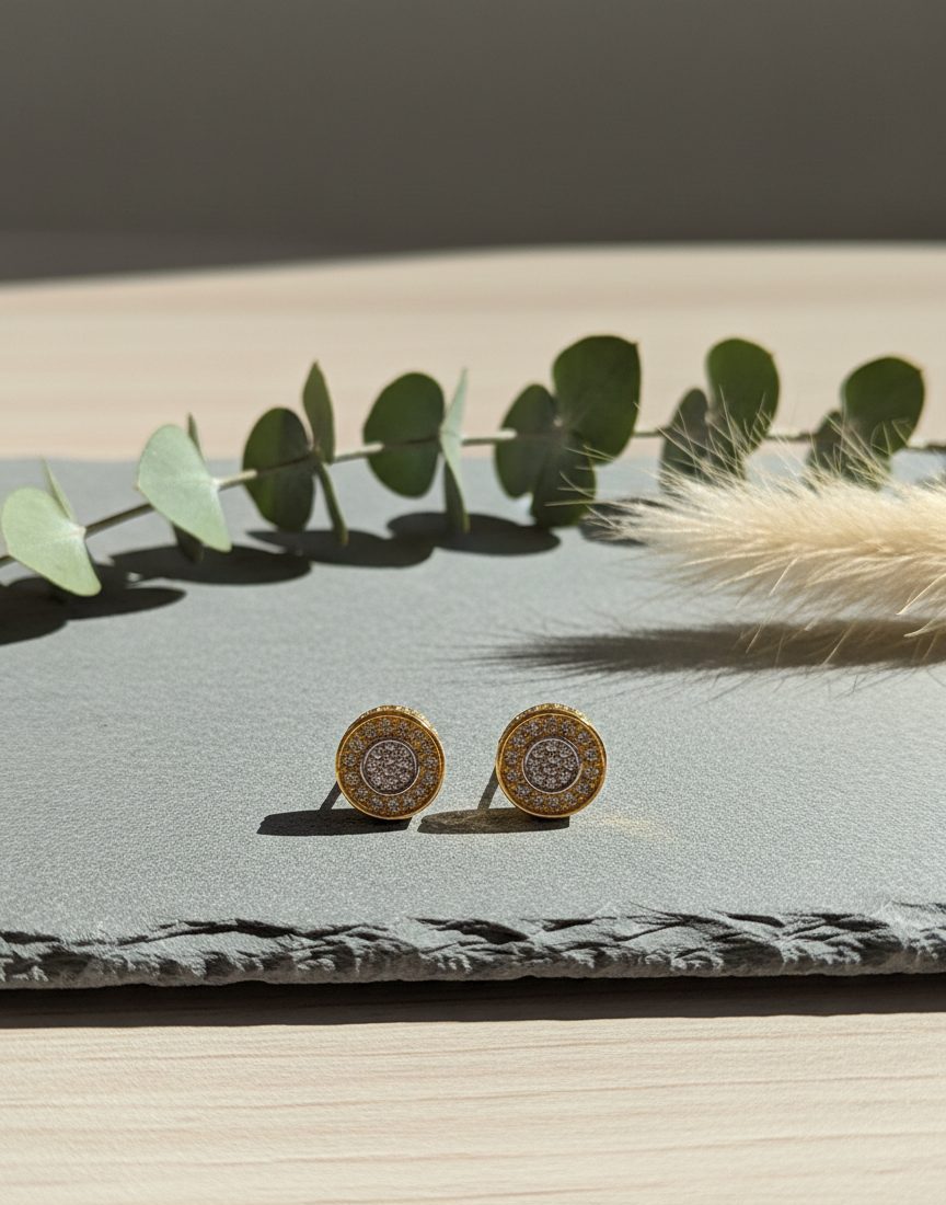 Estos elegantes pendientes presentan un diseño redondo y plano, elaborados en oro de 18 quilates que aporta un brillo cálido y sofisticado. La superficie está completamente adornada con circonitas blancas, creando un efecto deslumbrante y moderno. El cierre de presión garantiza comodidad y seguridad durante todo el día.