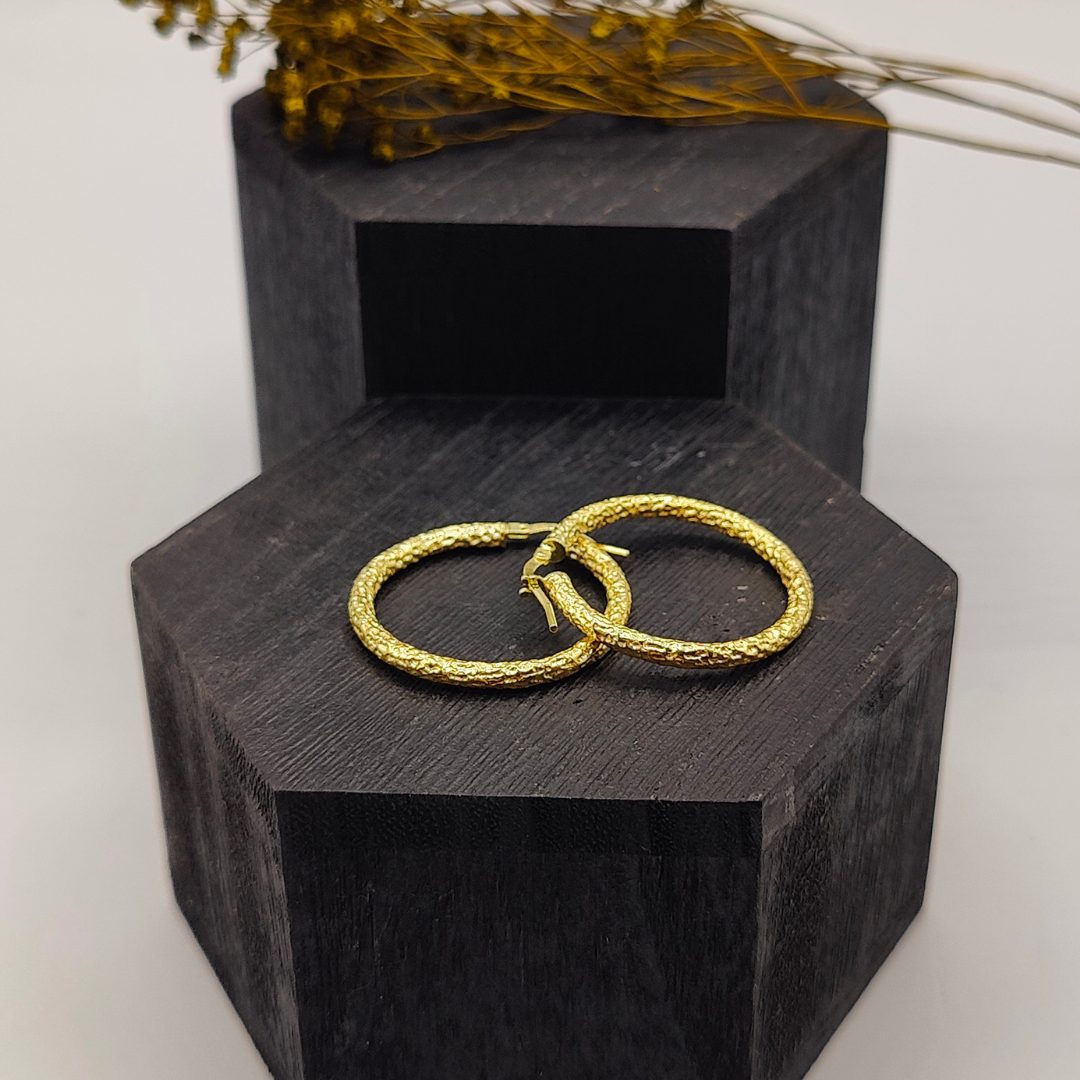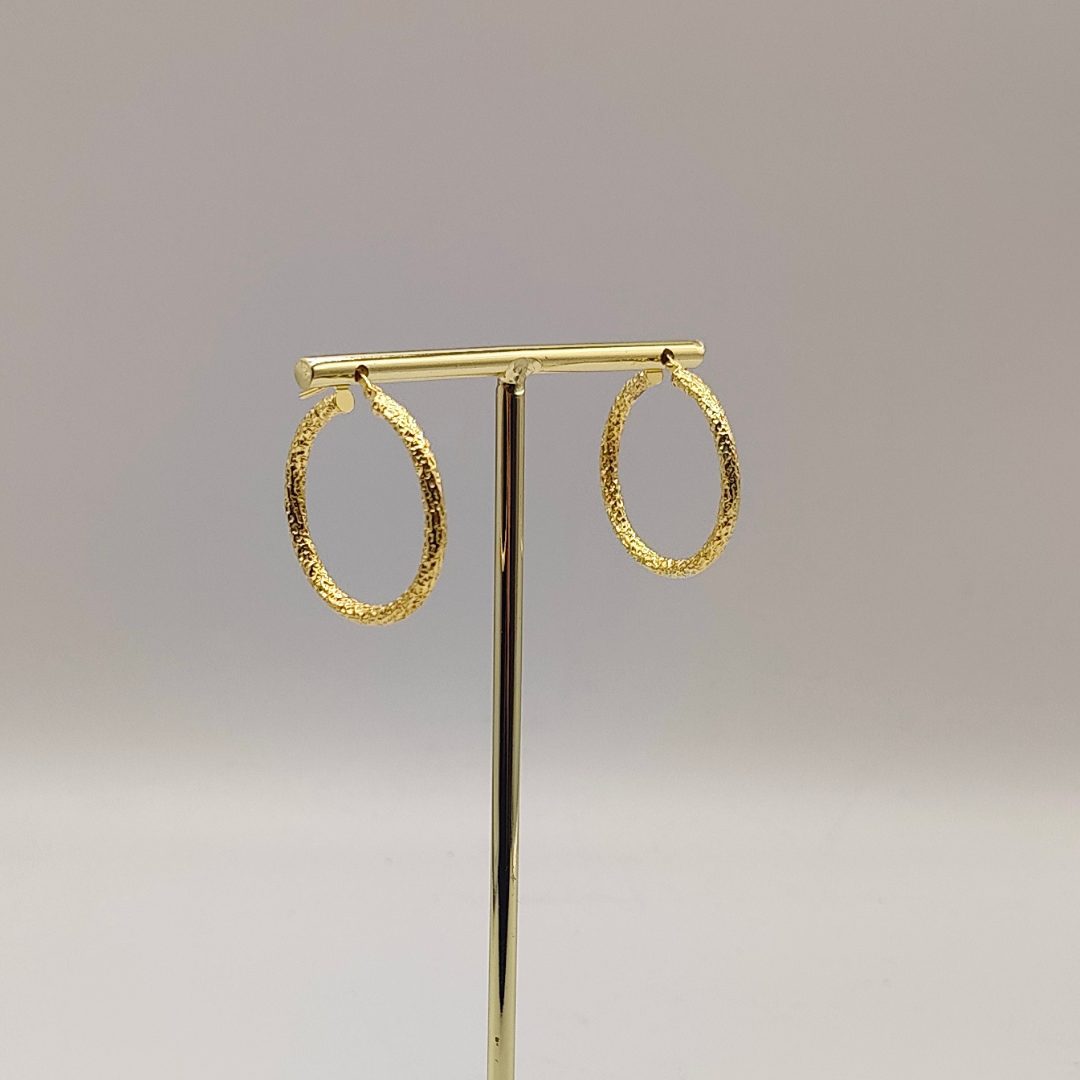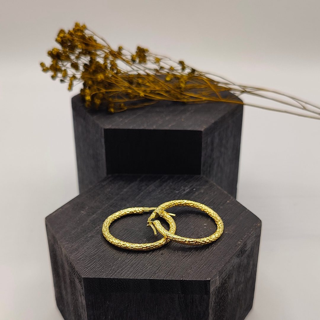 Este elegante pendiente de aro está elaborado en plata de alta calidad y recubierto con una capa de oro, lo que le da un acabado brillante y cómodo. Lo que lo hace aún más especial es su textura única, que aporta un toque moderno y distintivo al diseño clásico del aro.