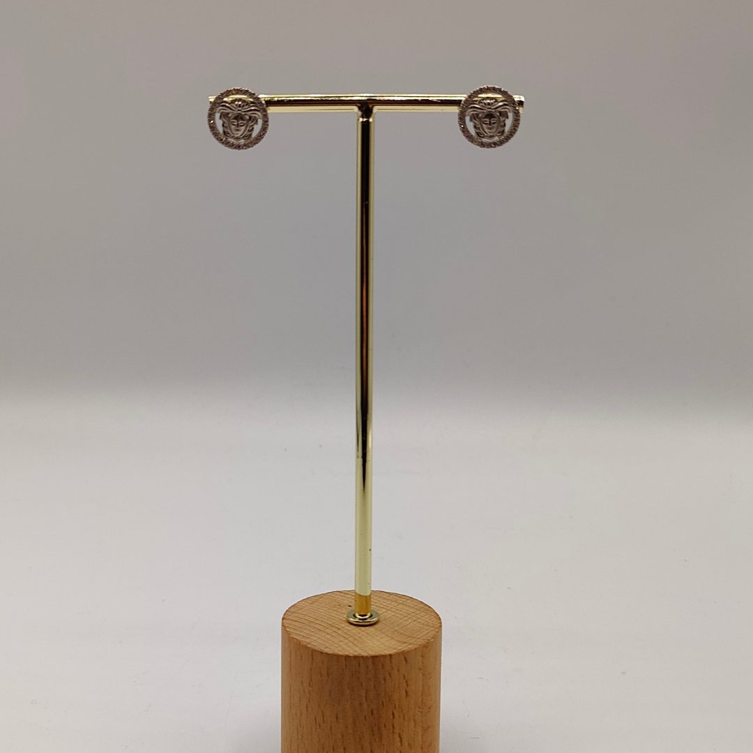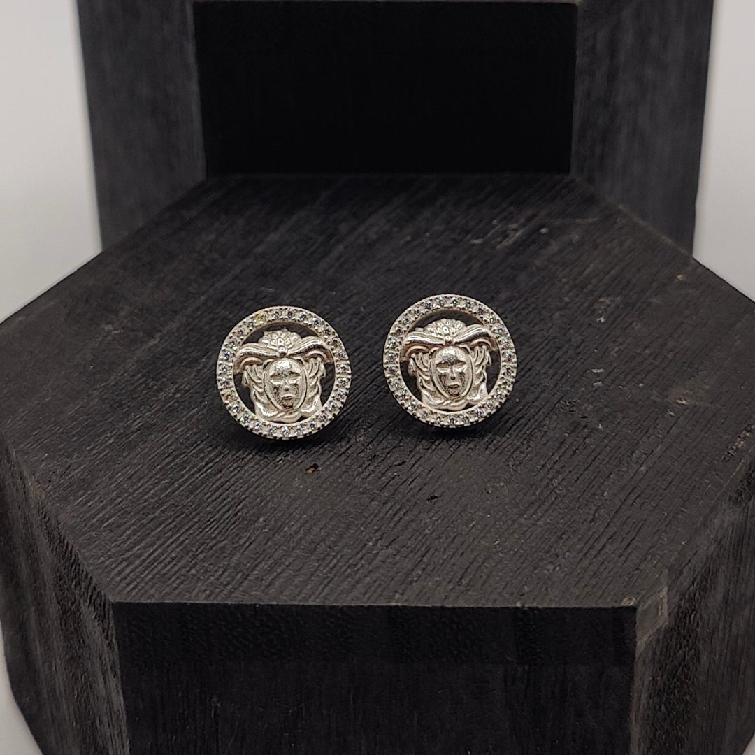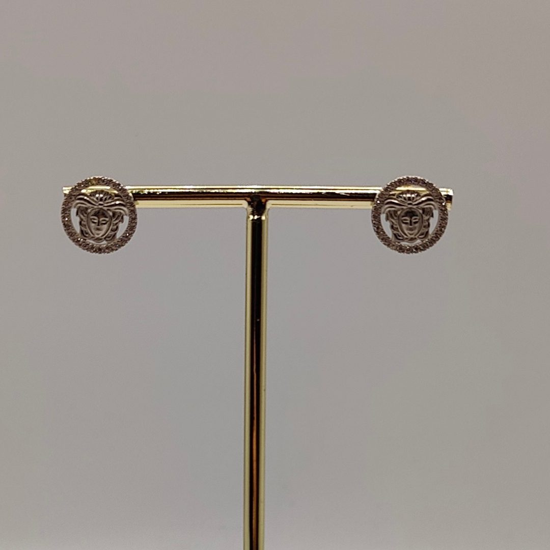 Este impresionante pendiente, inspirado en los icónicos diseños de Versace, presenta una figura de cara detallada y elegante, marcada por circonitas