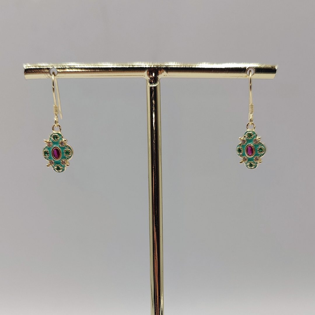 Este pendiente colgante presenta un diseño floral encantador, elaborado en plata de ley bañada en oro. La flor, esmaltada en un delicado tono verde, está adornada con cuatro circonitas verde oscuro que aportan profundidad y brillo. En el centro, una circonita granate añade un contraste vibrante y sofisticado. El pendiente cuenta con un cierre de presión tipo garra, asegurando comodidad y seguridad durante su uso.