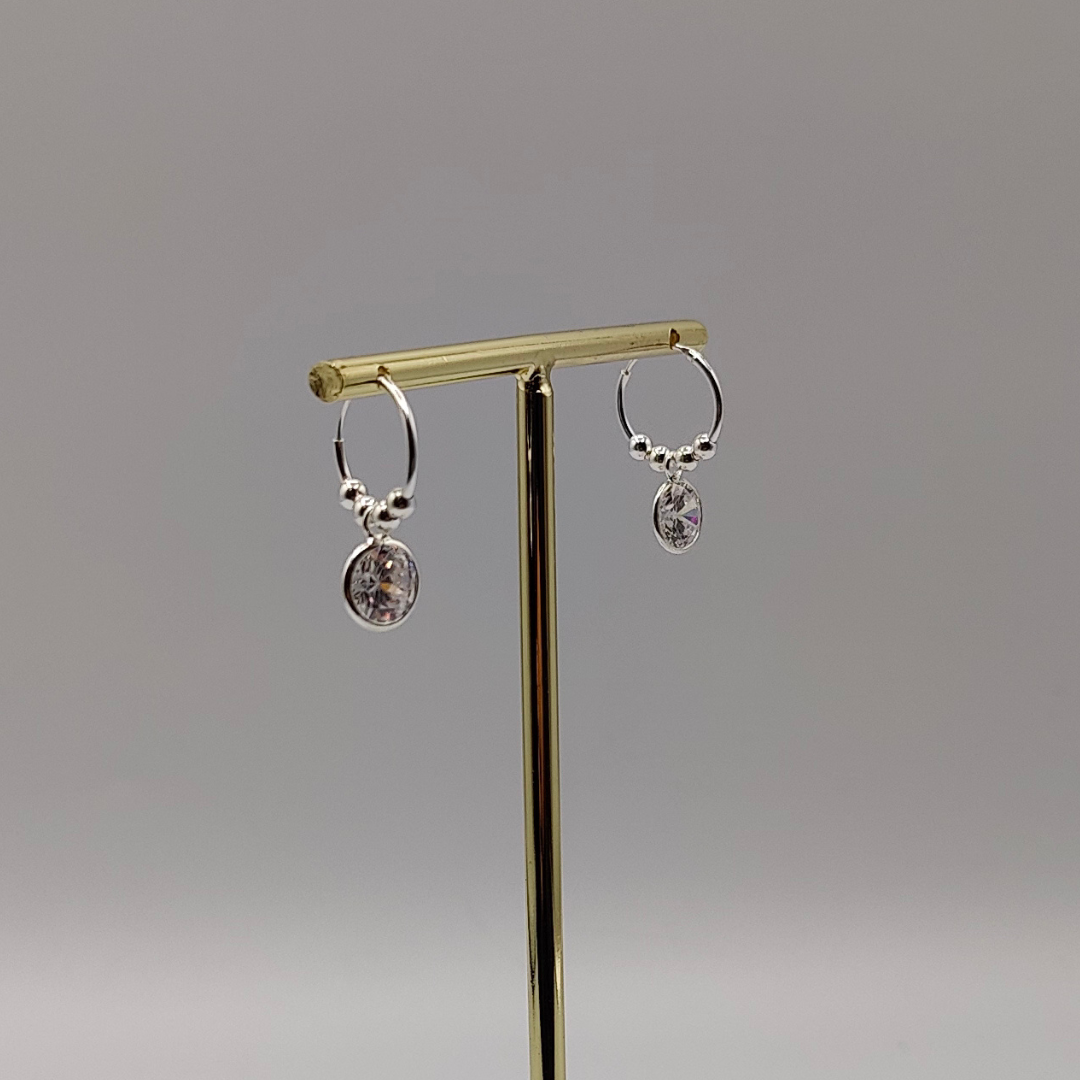 El aro está fabricado en metal de alta calidad con un acabado pulido, garantizando durabilidad y un brillo que complementa la belleza de la circonita. Su diseño colgante permite que la pied