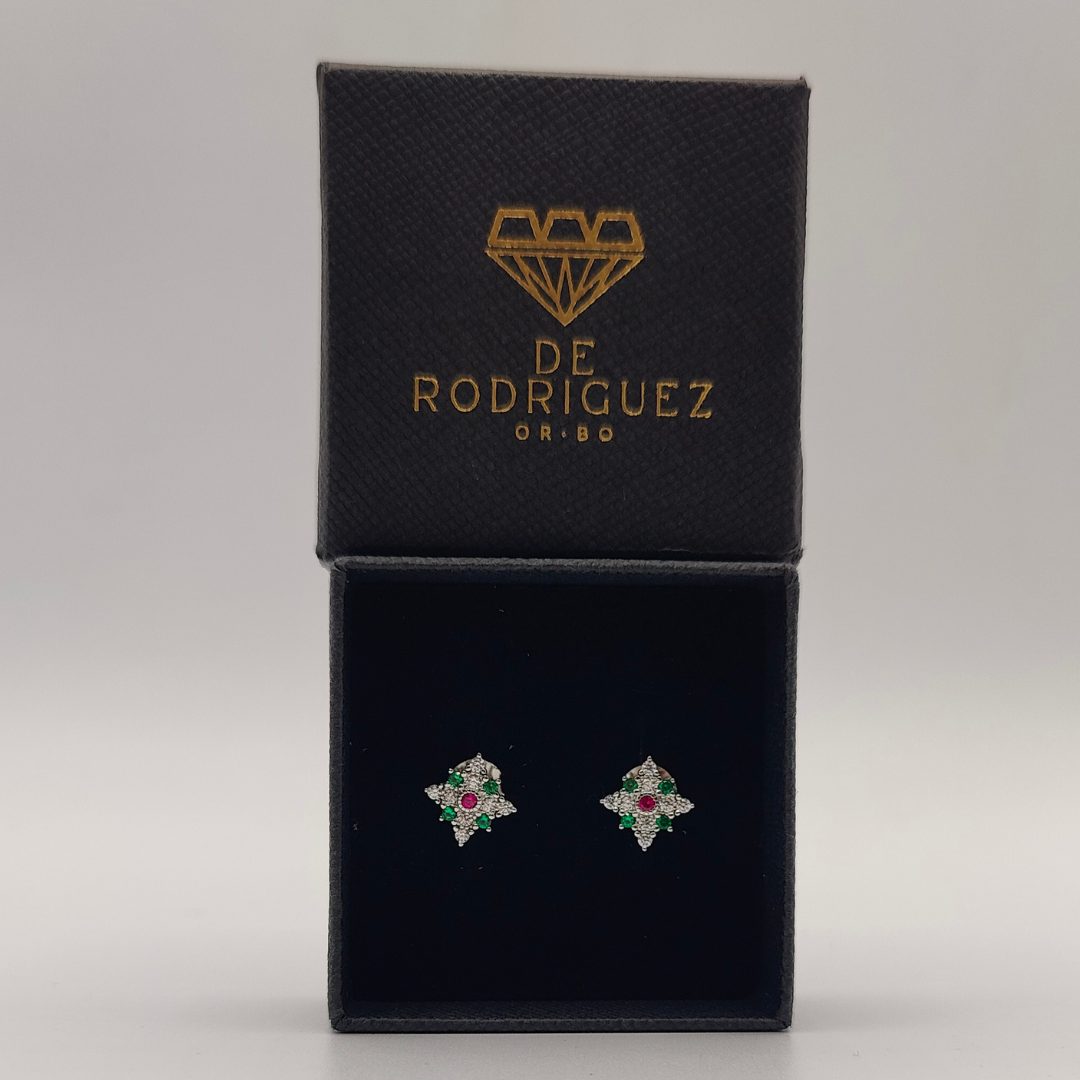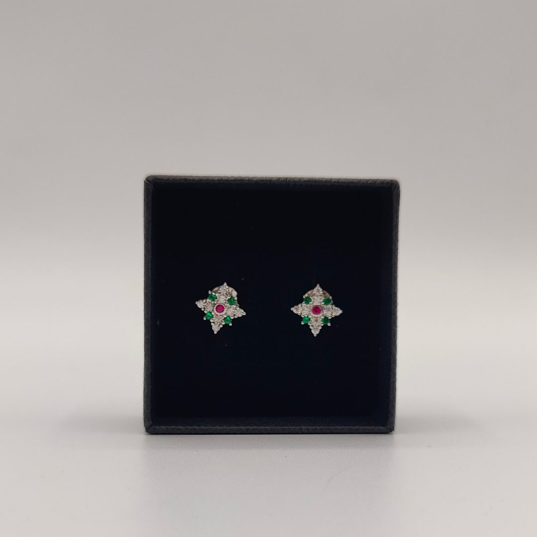 Este delicado pendiente en forma de estrella está elaborado en plata de ley 925, combinando elegancia y un diseño simbólico. La estrella está adornada con circonitas blancas que aportan un brillo sutil y refinado. En el centro, una circonita rosa añade un toque de color vibrante, mientras que en los extremos, circonitas verdes completan el diseño con un contraste armonioso. El cierre de presión garantiza comodidad y seguridad durante todo el día.