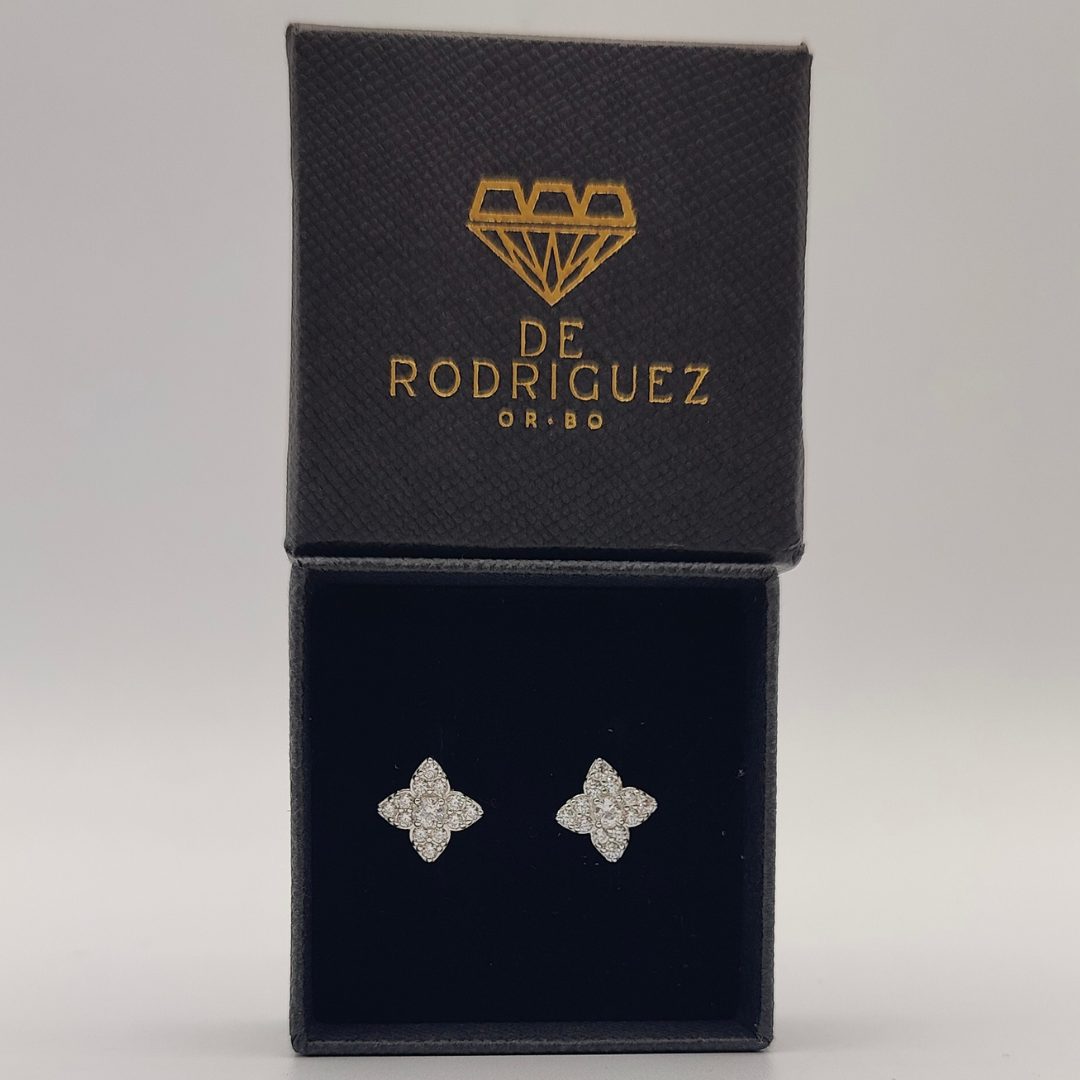 Este delicado pendiente presenta un diseño floral, elaborado en plata de ley 925 y adornado con circonitas blancas que aportan un brillo sutil y refinado. Su cierre de presión garantiza comodidad y seguridad durante todo el día.
