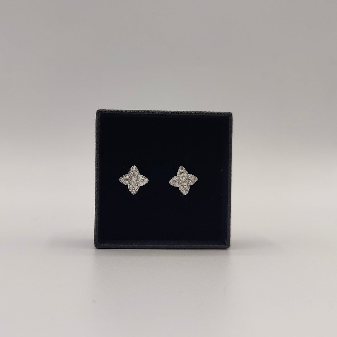 Este delicado pendiente presenta un diseño floral, elaborado en plata de ley 925 y adornado con circonitas blancas que aportan un brillo sutil y refinado.