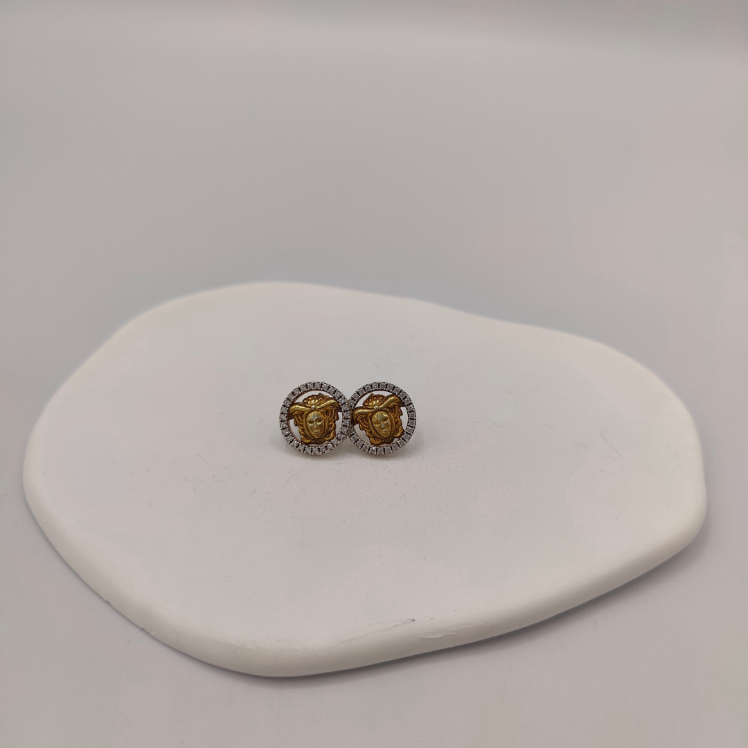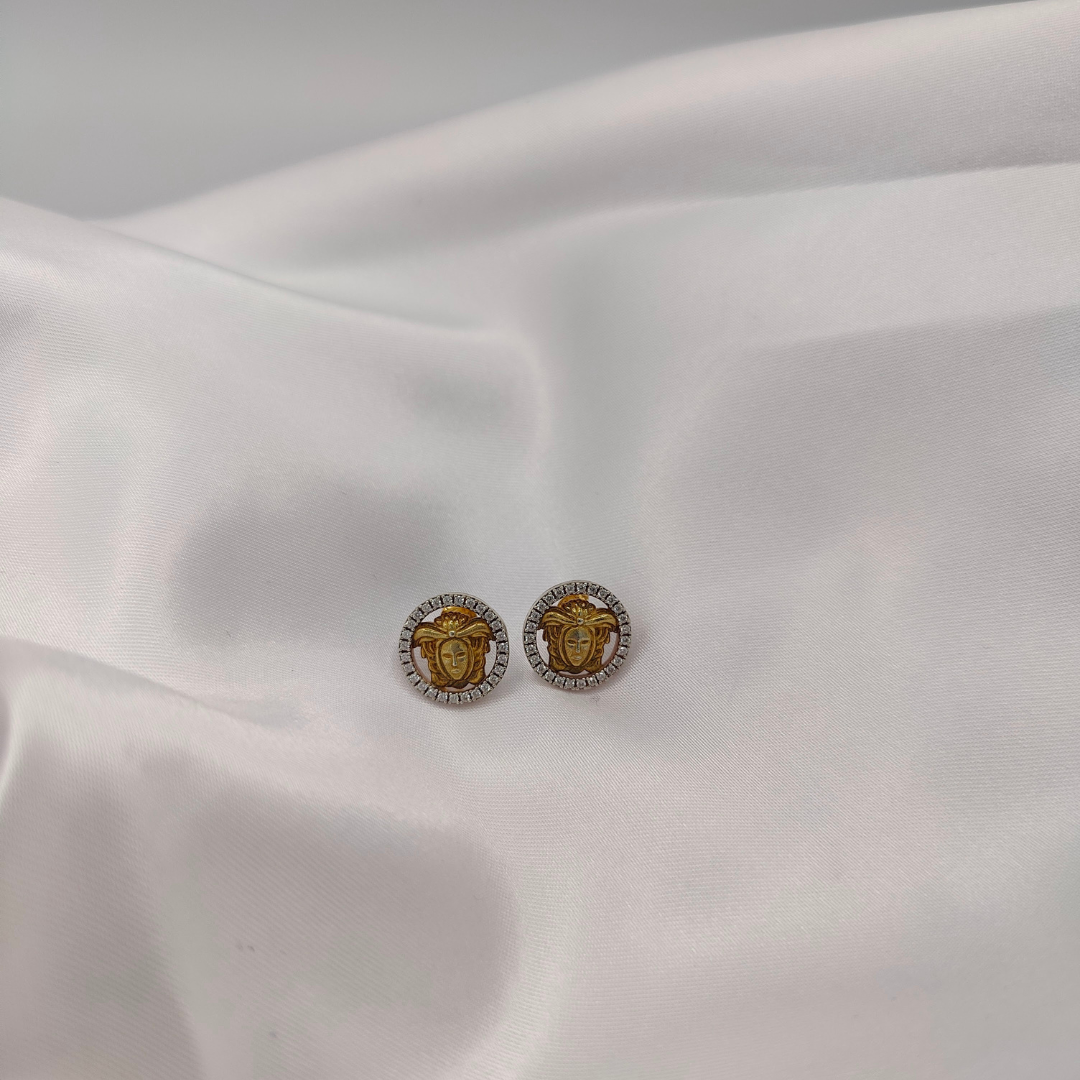 Este elegante pendiente tipo botón presenta un diseño redondo adornado con circonitas que añaden un brillo sutil y sofisticado. En el centro, destaca la cabeza de Medusa, símbolo de fuerza y poder. La cabeza de Medusa está finamente detallada, capturando su mirada hipnótica y su esencia mítica.
