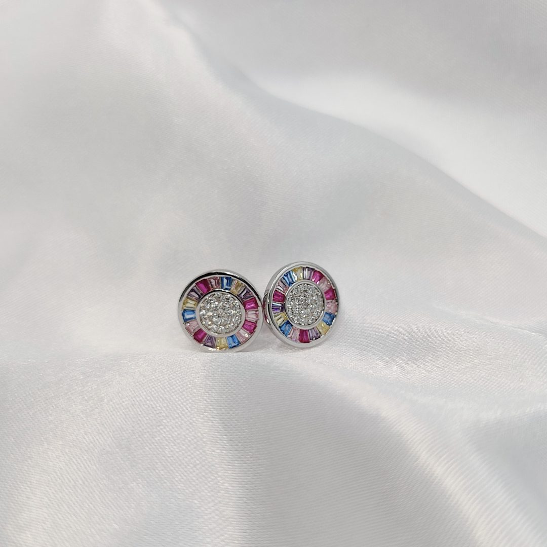 Este elegante pendiente redondo está elaborado en plata de ley, presentando un diseño sofisticado y colorido. La pieza destaca por su forma circular adornada con circonitas en talla baguette