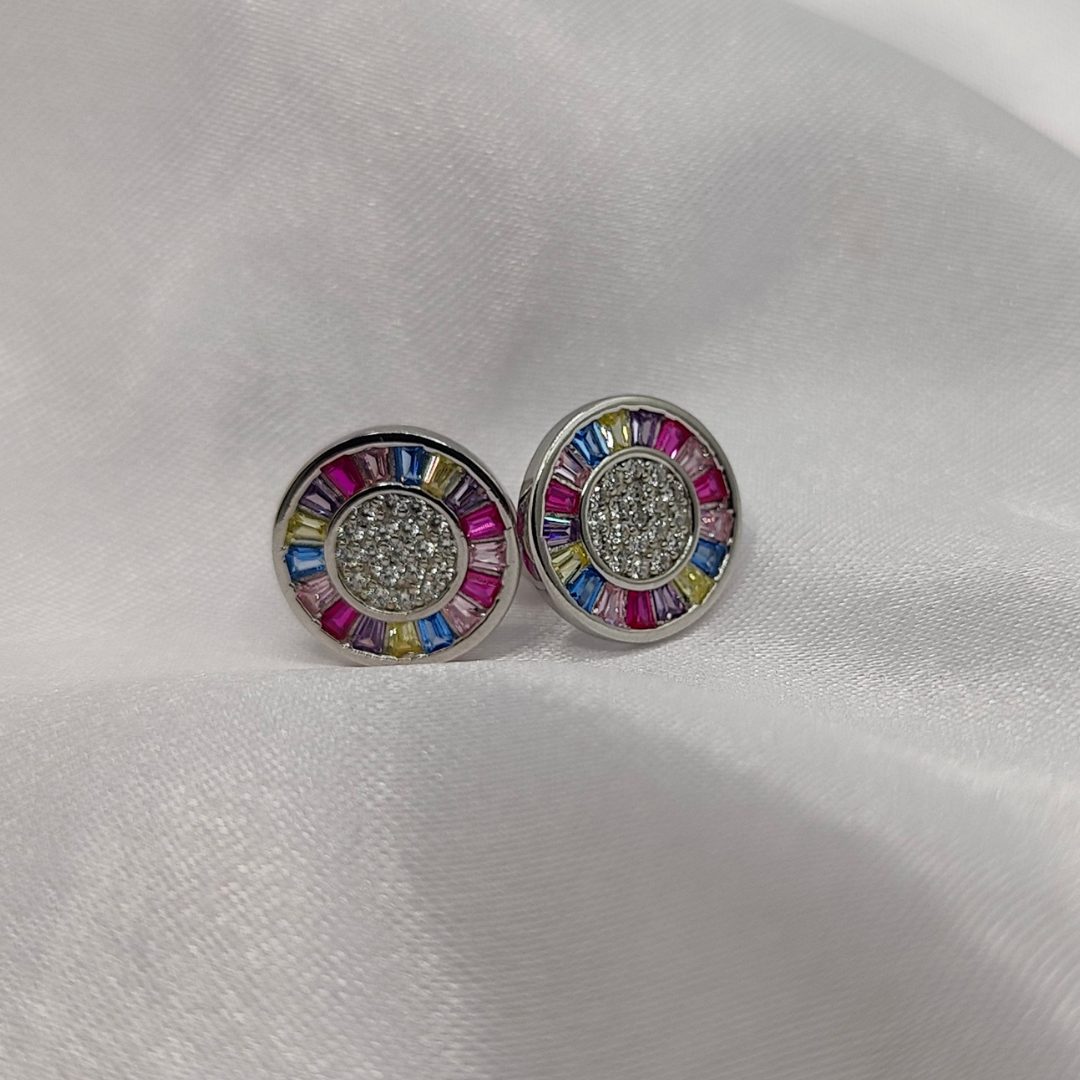 Este elegante pendiente redondo está elaborado en plata de ley, presentando un diseño sofisticado y colorido. La pieza destaca por su forma circular adornada con circonitas en talla baguette de colores, que aportan un destello vibrante y moderno. En el centro, circonitas blancas añaden un toque de brillo sutil y refinado. El cierre de presión garantiza comodidad y seguridad durante todo el día.