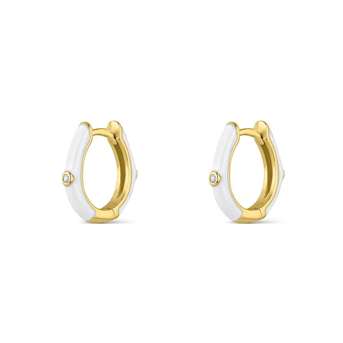 Modernos y versátiles, estos pendientes tipo aro están elaborados en plata de ley 925 chapada, con un delicado acabado de esmalte blanco