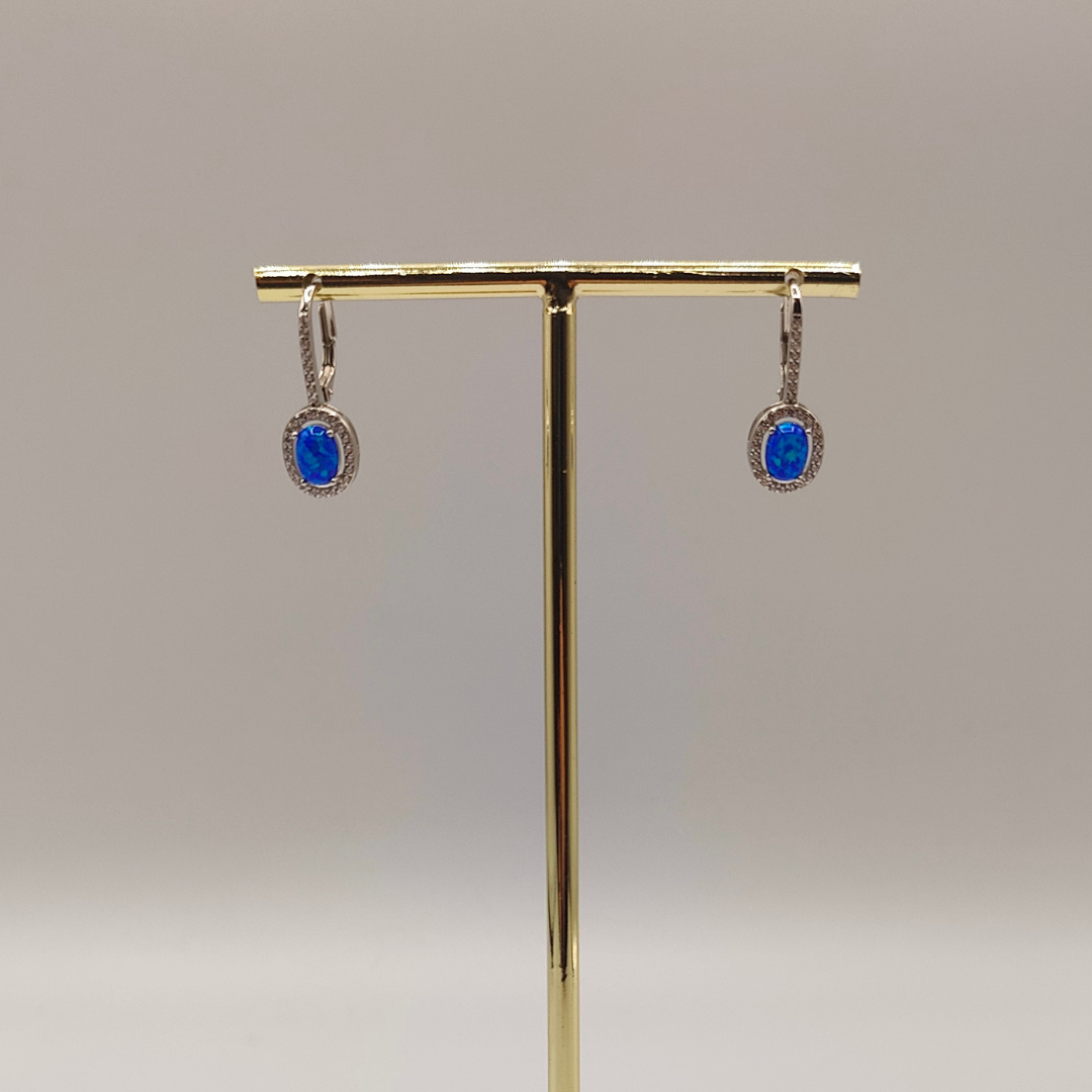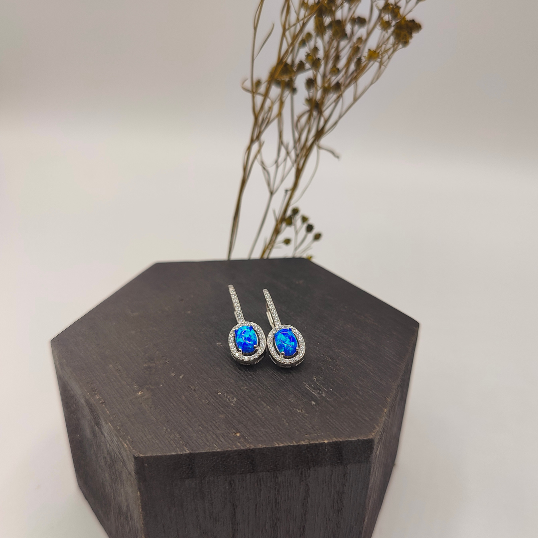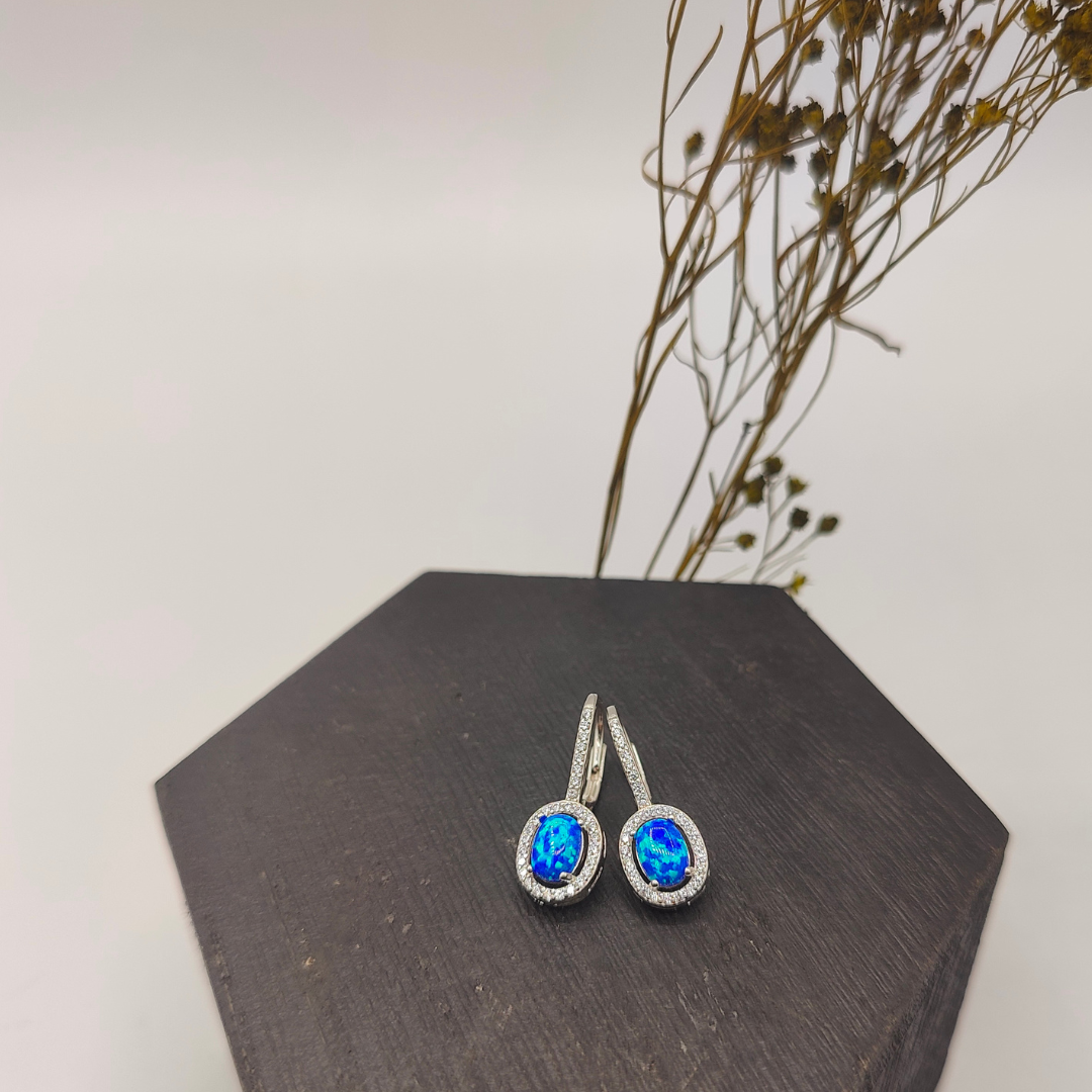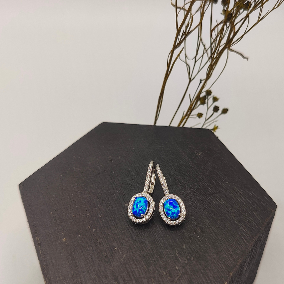 El diseño colgante permite que las circonitas brillen intensamente al moverse, creando un juego de luces que captura la atención. En el centro, el ópalo destaca con su iridiscencia única, mostrando una hermosa paleta de colores que varía según la luz y el ángulo, lo que los convierte en una pieza verdaderamente e.