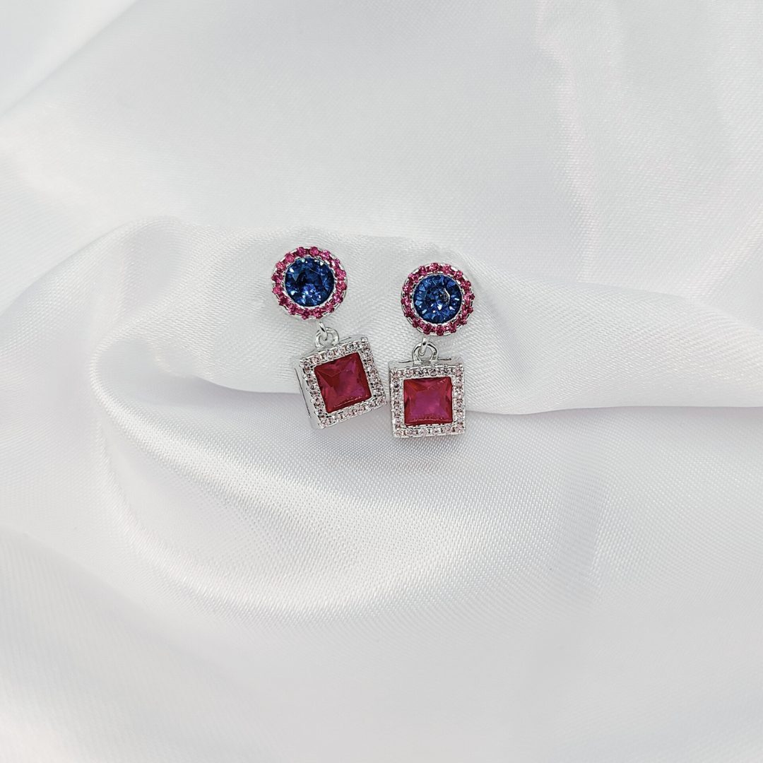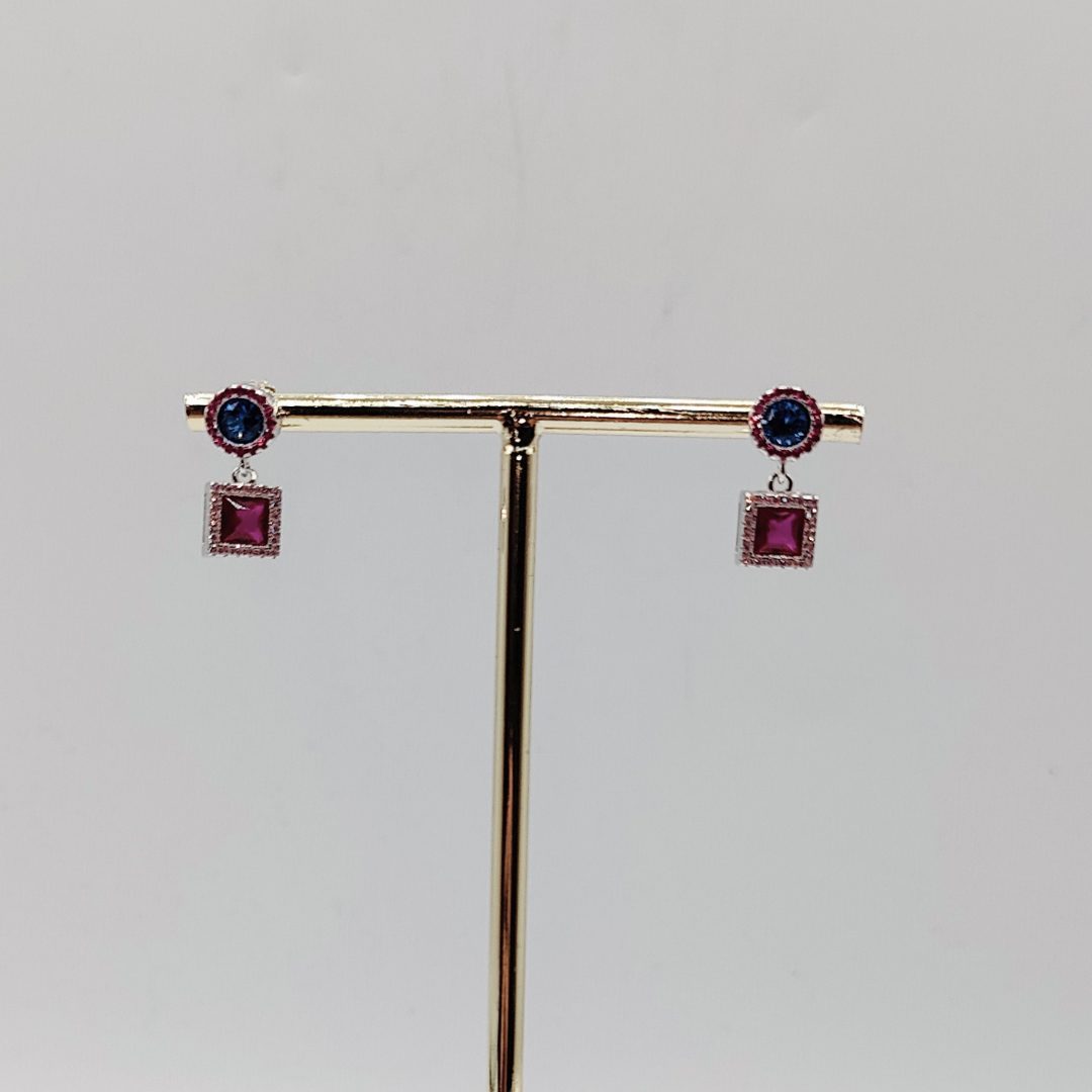 Estos elegantes pendientes colgantes están elaborados en plata de ley bañada en oro, combinando sofisticación y color. En la parte superior, una circonita azul noche central está rodeada por un halo de circonitas rosas, creando un efecto luminoso y delicado. En la parte inferior, un diseño cuadrado presenta una circonita rosa central, también enmarcada por circonitas rosas más claras, aportando un toque fresco y vibrante. El cierre de presión garantiza comodidad y seguridad durante todo el día.