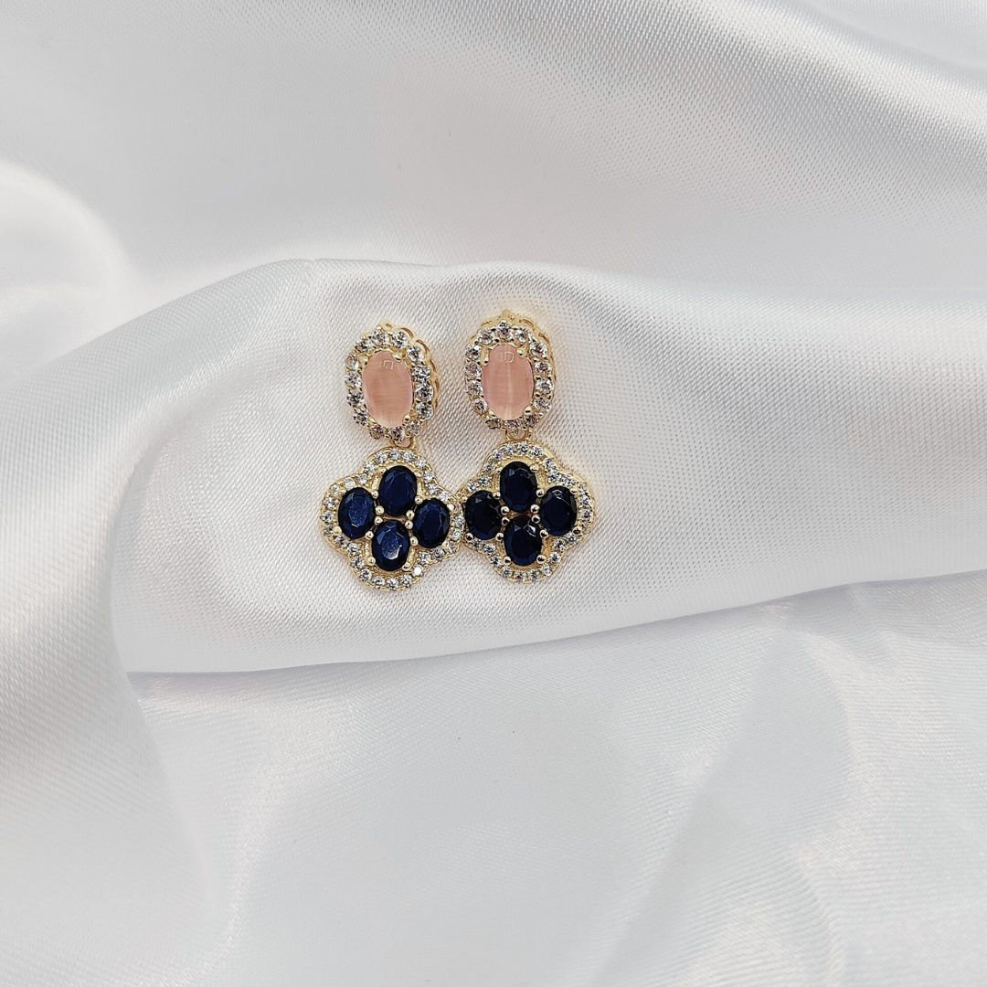 Estos elegantes pendientes colgantes están elaborados en plata de ley bañada en oro, combinando sofisticación y color. En la parte superior, una circonita rosa central está rodeada por un halo de circonitas blancas, creando un efecto luminoso y delicado. En la parte inferior, un diseño en forma de flor presenta cuatro circonitas azul cielo en el centro, también enmarcadas por circonitas blancas, aportando un toque fresco y vibrante. El cierre de presión garantiza comodidad y seguridad durante todo el día.