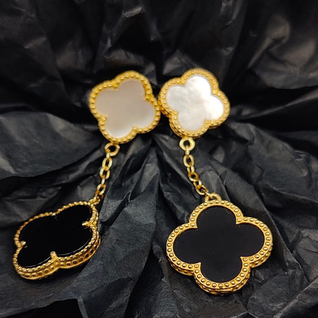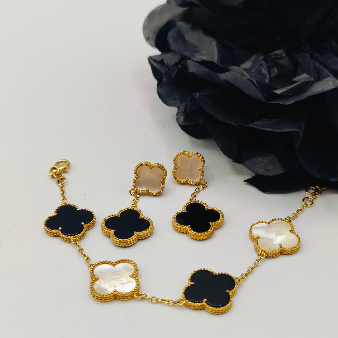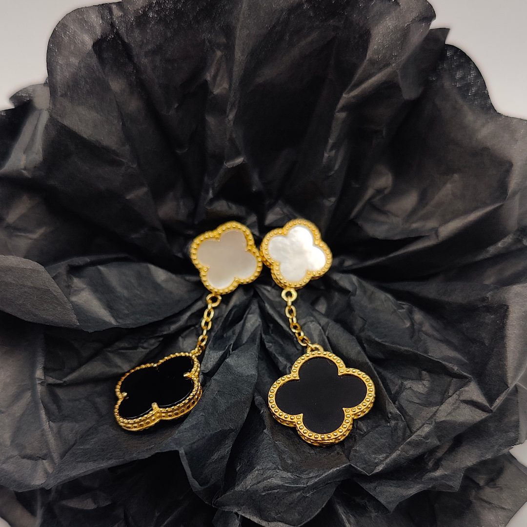 Luce un estilo cómodo y único con nuestros Pendientes Van Cleef en plata dorada , adornados cnácar y piedra ónix . Estos pendientes, con un diseño inspirado en la elegancia clásica.
