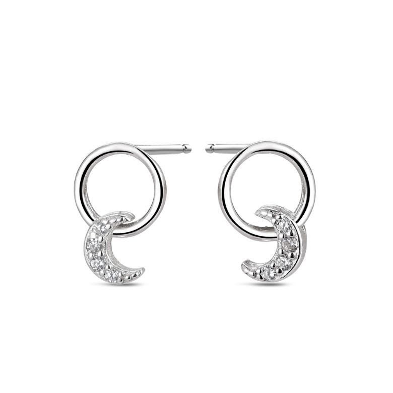 Estos delicados pendientes de aro en plata de ley 925 rodiada destacan por su colgante en forma de luna decorado con circonitas blancas.