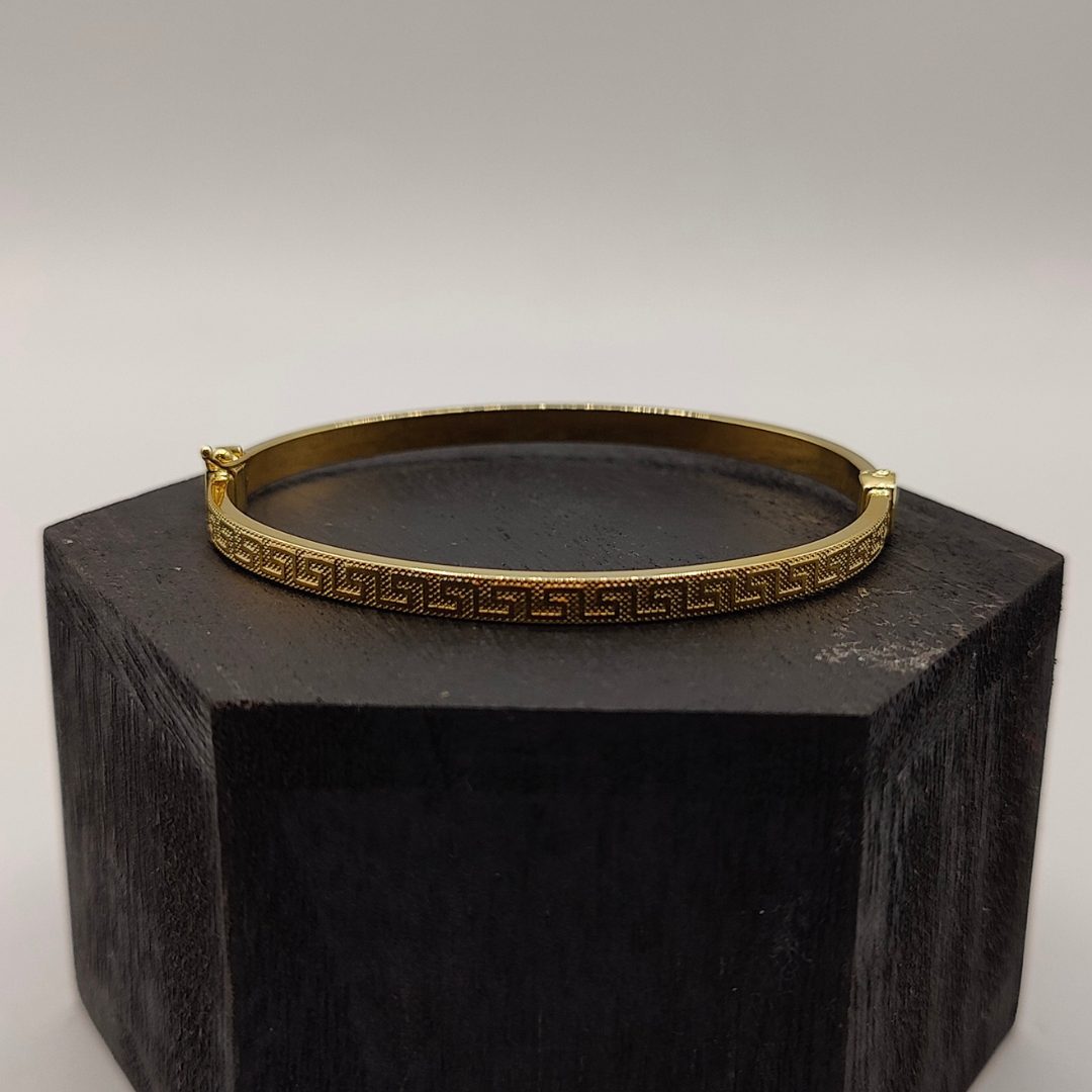 Este brazalete estilo Versace en oro de 18K es la definición de lujo y elegancia. Su diseño imponente y refinado refleja la sofisticación clásica de la marca, con detalles meticulosamente elaborados para destacar tu estilo único.