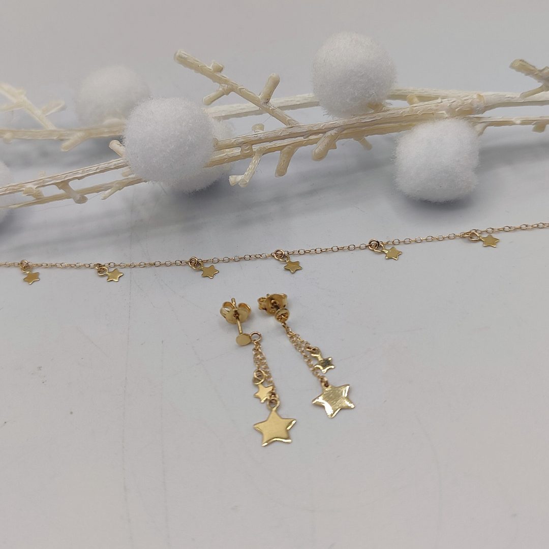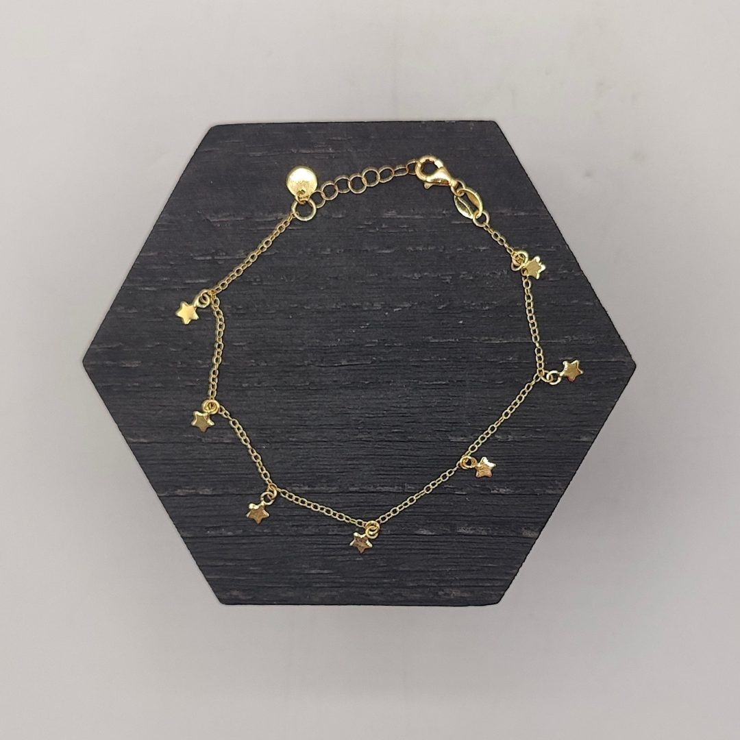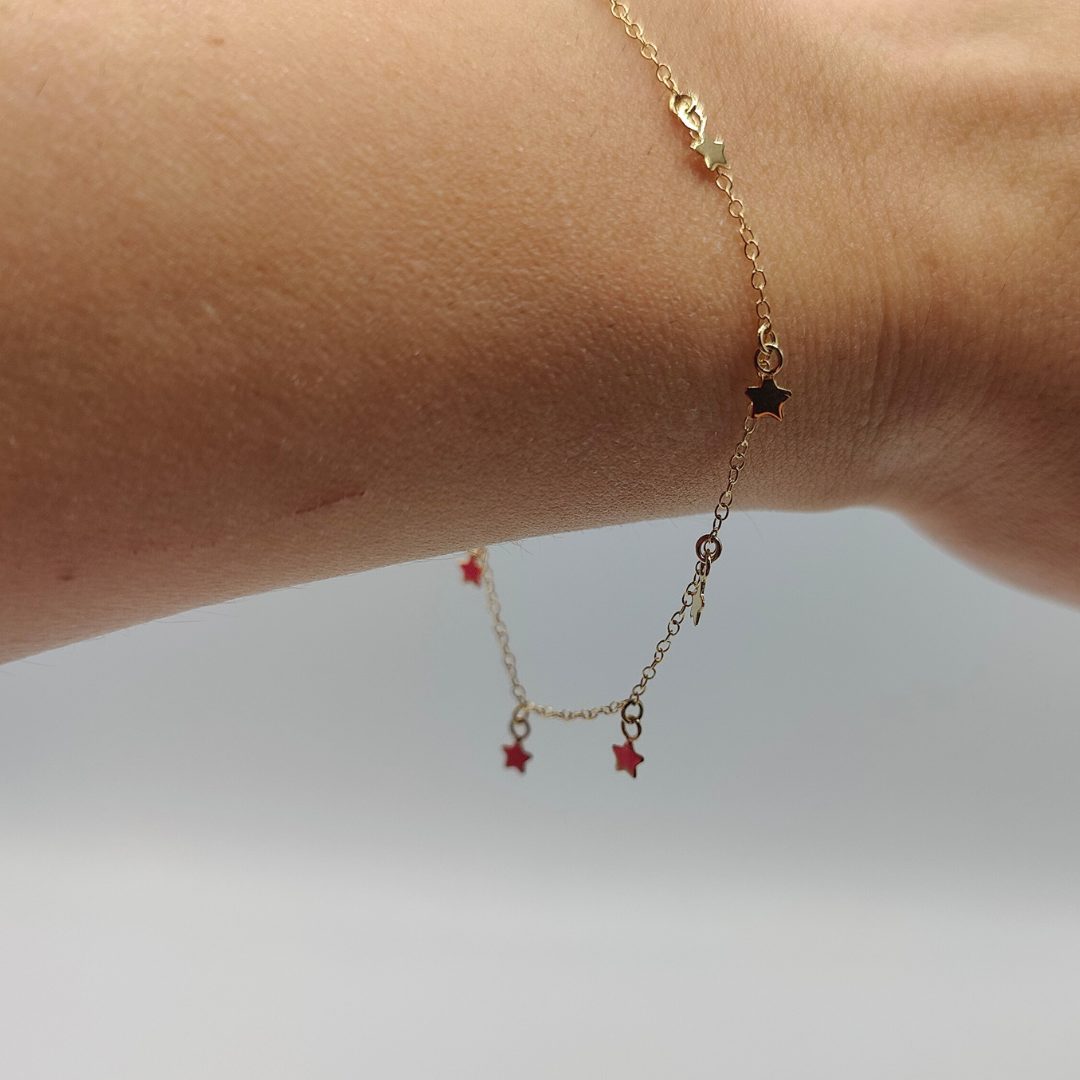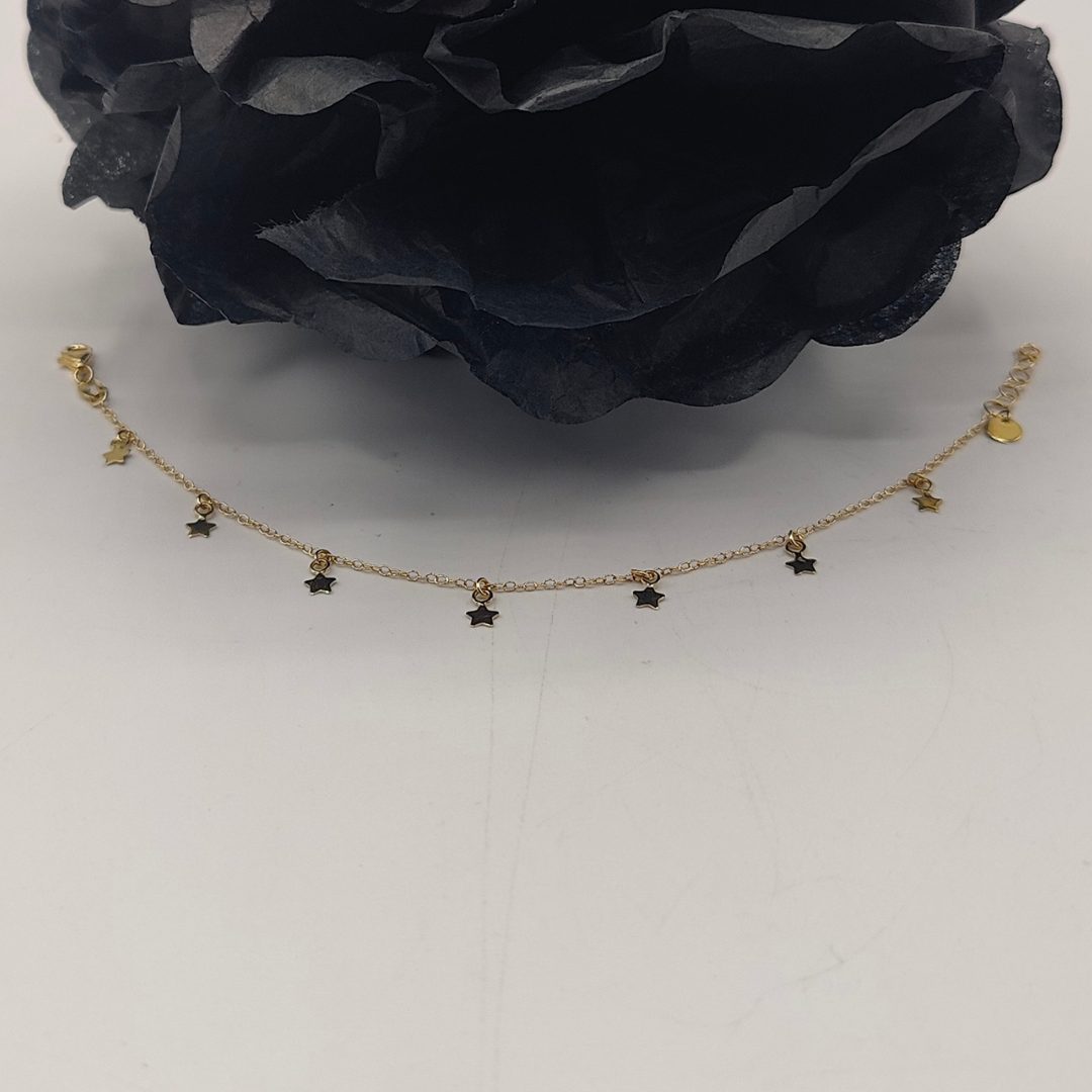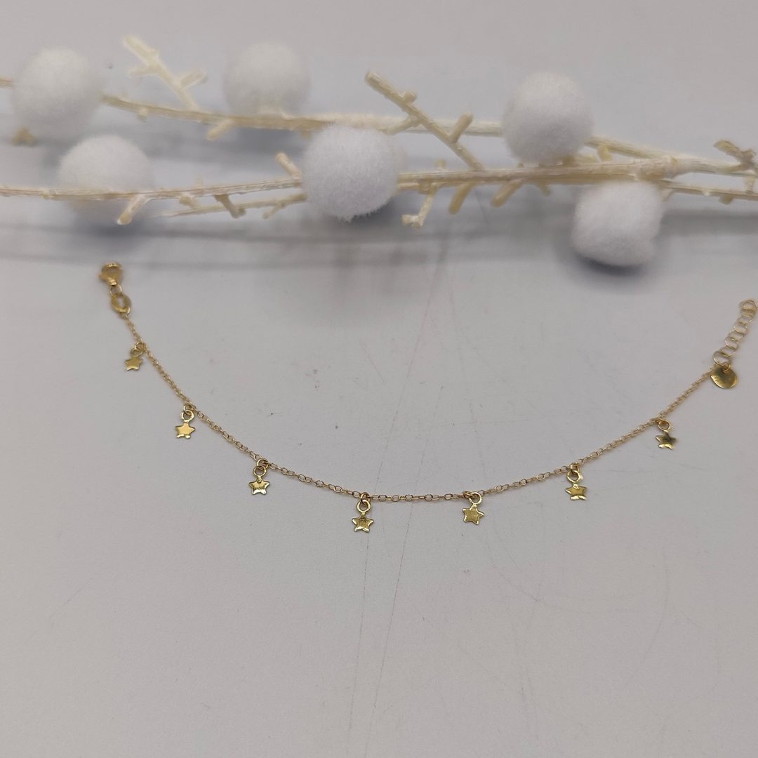 Una pieza encantadora y llena de brillo. Esta pulsera de 18,7 cm de largo, con cadena rolo y estrellas colgantes, está fabricada en oro de 18K. Su diseño delicado y moderno la convierte en el complemento perfecto para cualquier ocasión, añadiendo un toque celestial y sofisticado a tu look. Ideal para quienes buscan una joya elegante y versátil, esta pulsera ofrece un estilo único y encantador.