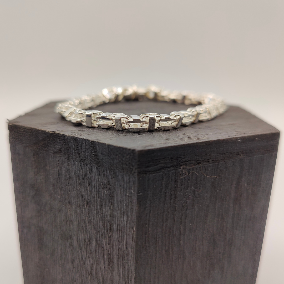 Fabricada en plata, puede tener un acabado pulido o envejecido, destacando su belleza y durabilidad. Las pulseras bizantinas a menudo incluyen detalles ornamentales como grabados, filigranas o incrustaciones, lo que les confiere un aire de elegancia y distinción.