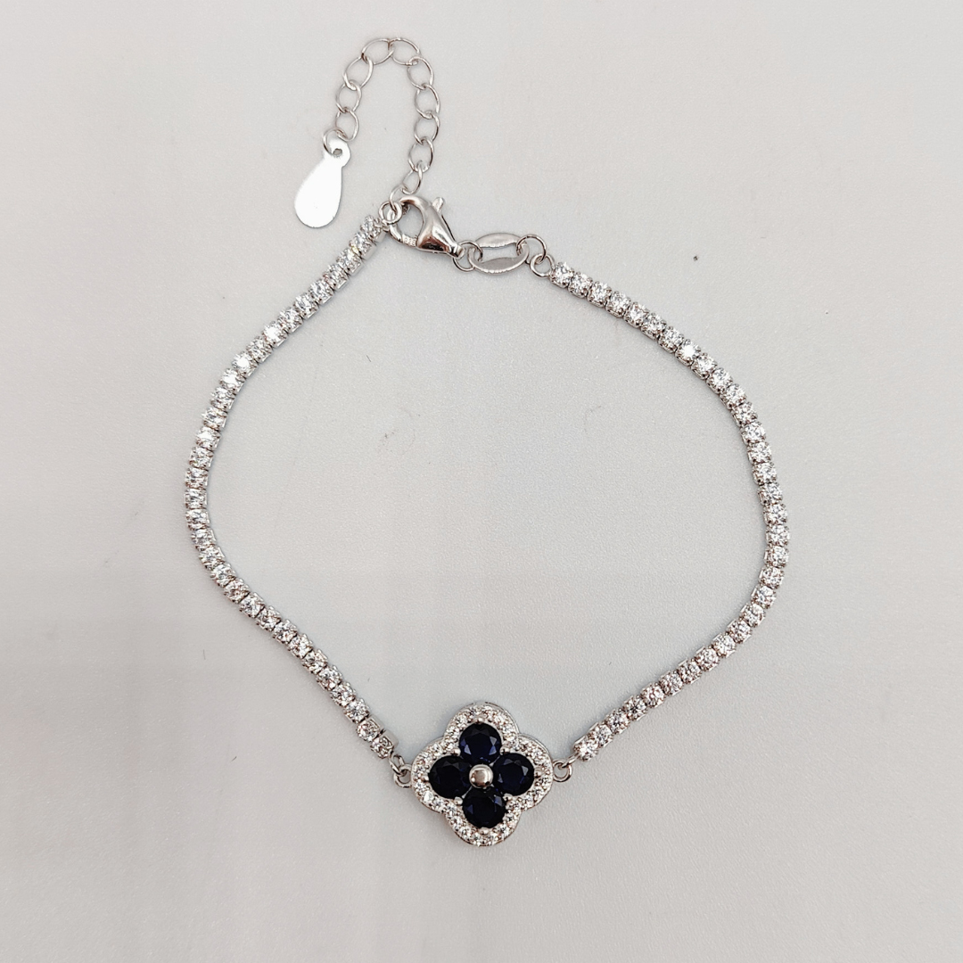 Esta pulsera es una verdadera obra de arte, diseñada para captar la atención con su belleza y elegancia. Está adornada con circonitas brillantes que rodean una flor central en azul, también decorada con circonitas azules más pequeñas para resaltar su diseño floral.