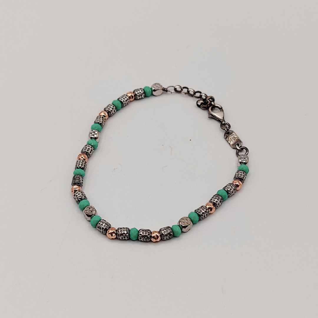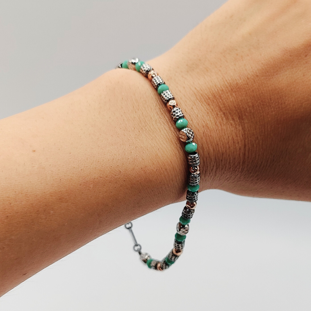 El diseño de bolitas de colores azules hace que esta pulsera sea versátil y fácil de combinar con diferentes conjuntos y estilos. El acabado en plata resalta la belleza de los tonos azules, proporcionando un contraste elegante y refinado.