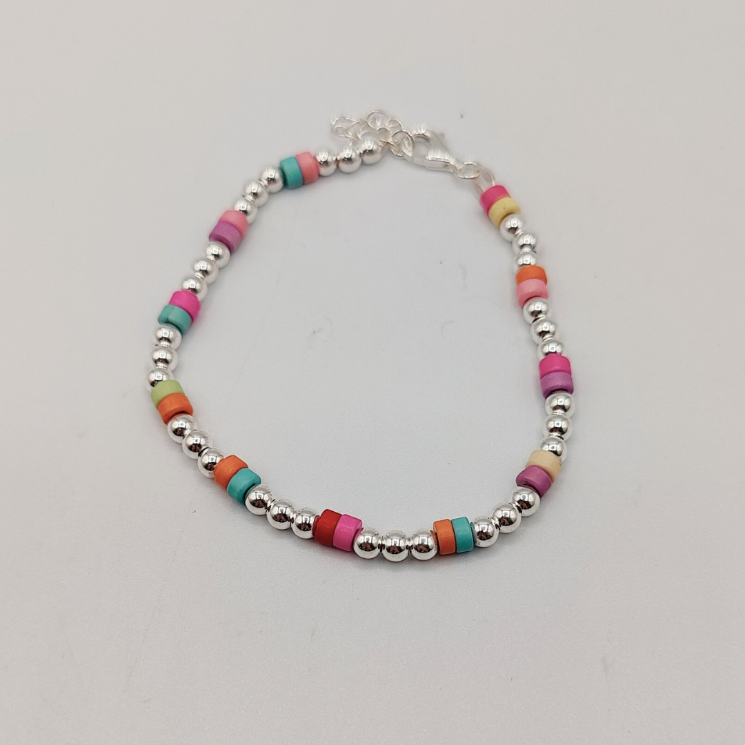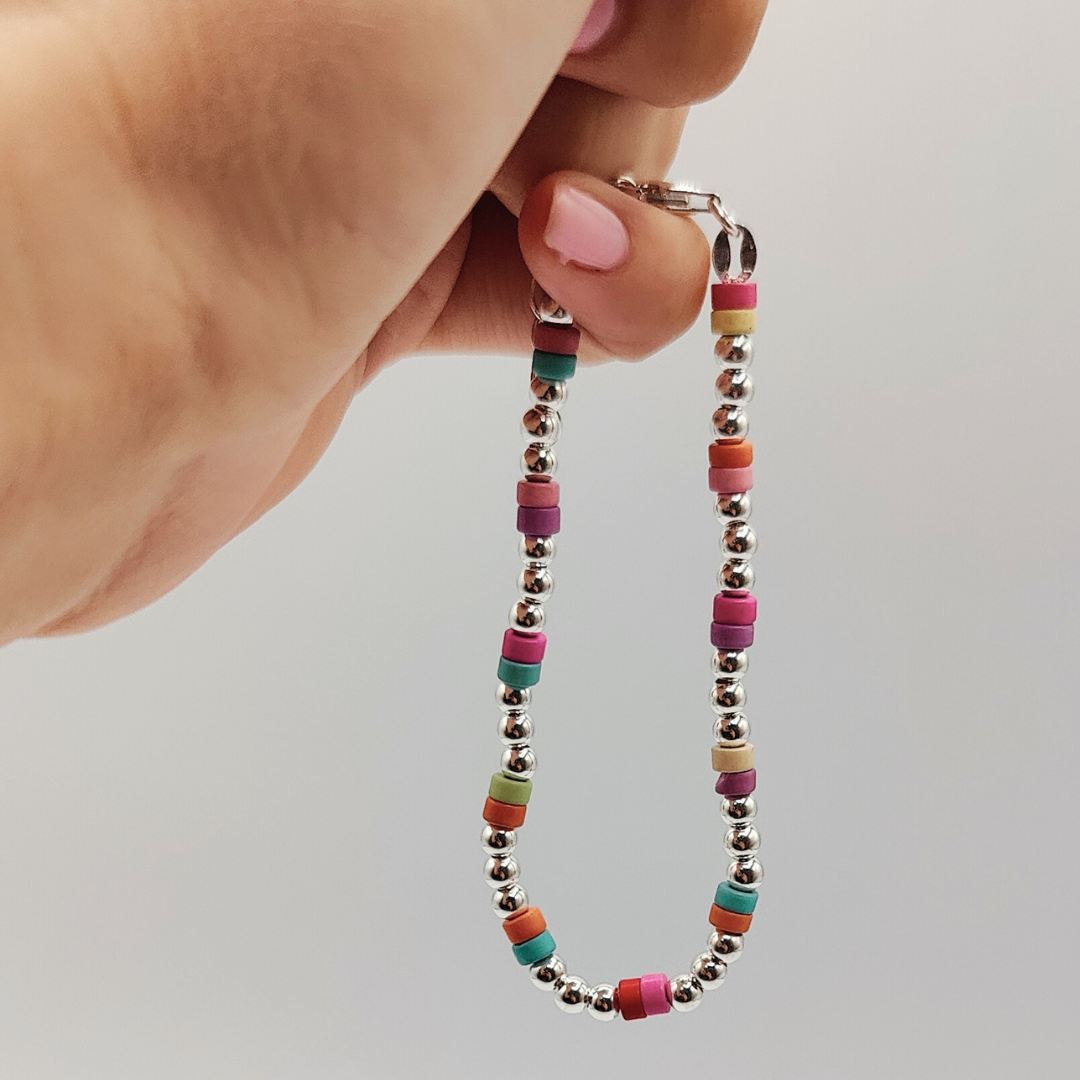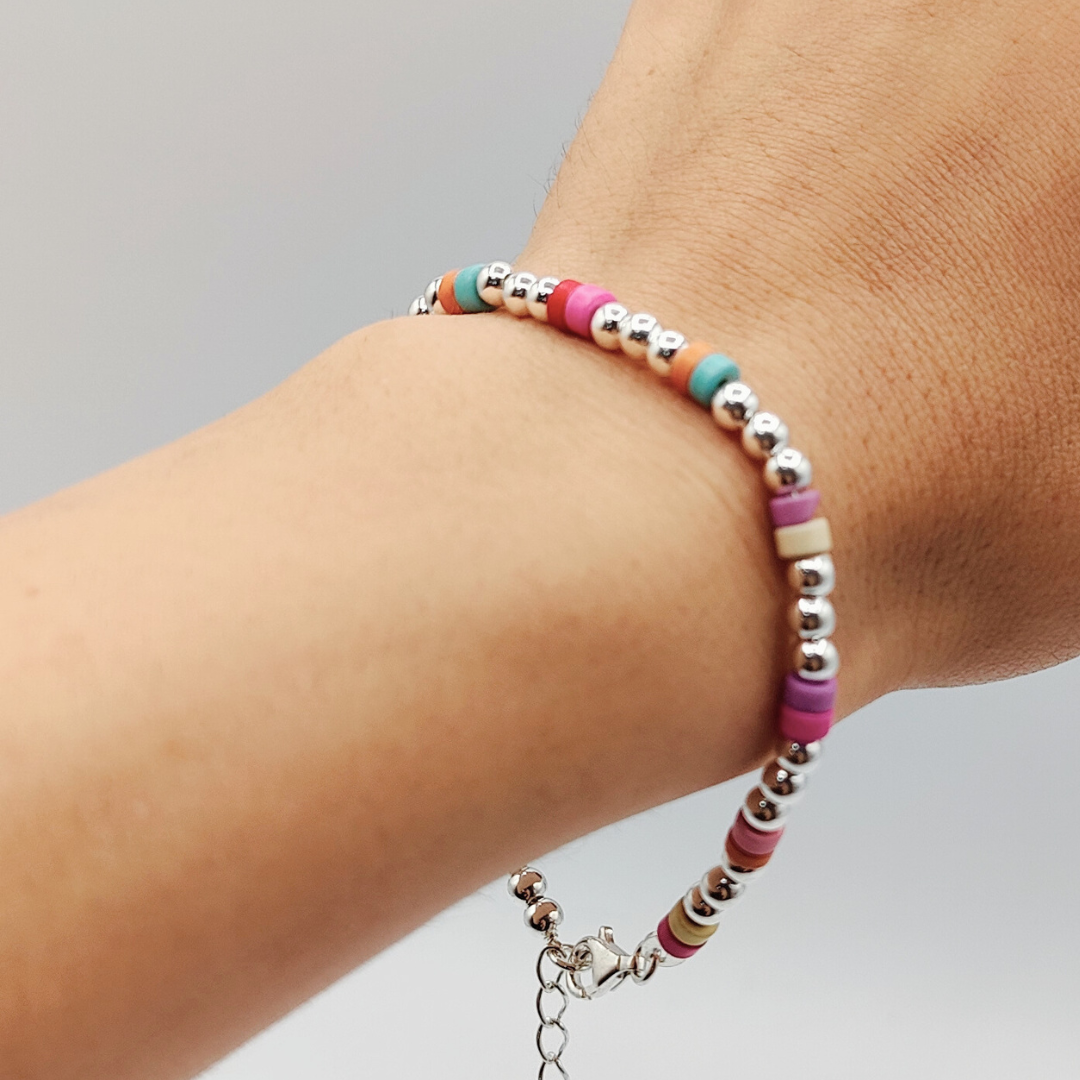 Esta encantadora pulsera está elaborada en plata, destacando por sus bolitas de colores pasteles que añaden un toque de alegría y delicadeza a tu estilo.