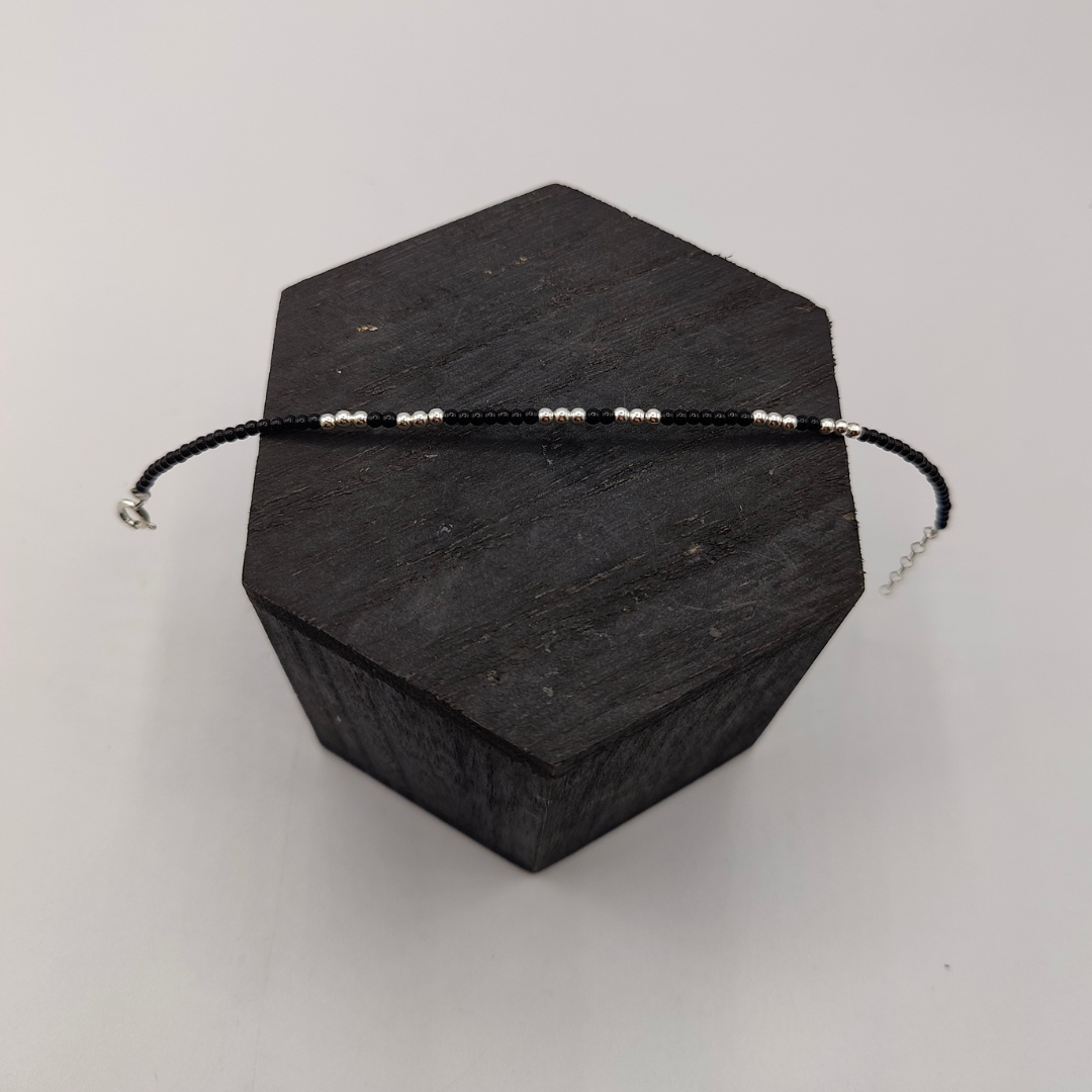El diseño minimalista pero llamativo de esta pulsera la convierte en un accesorio versátil, ideal tanto para un look casual como para eventos más formales. Las bolitas plateadas reflejan la luz de manera sutil, mientras que las negras aportan un aire de misterio y elegancia.