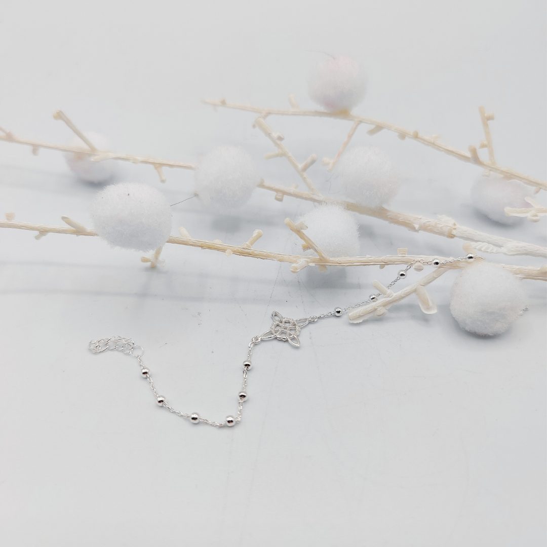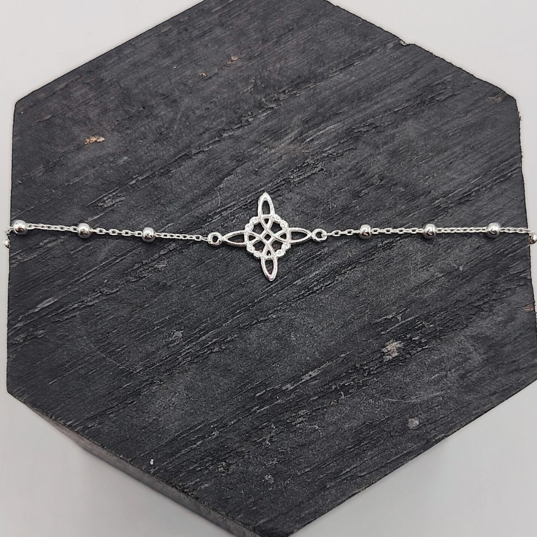 Sutil y con un toque de misterio, esta pulsera de plata de ley 925 presenta el símbolo del nudo de bruja, un amuleto conocido por su poder protector y de conexión espiritual.