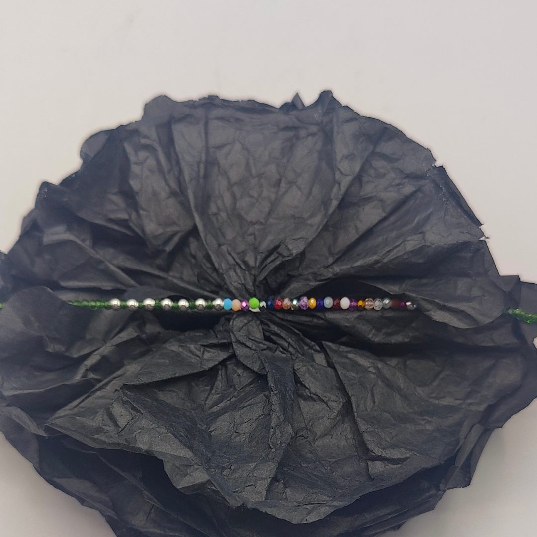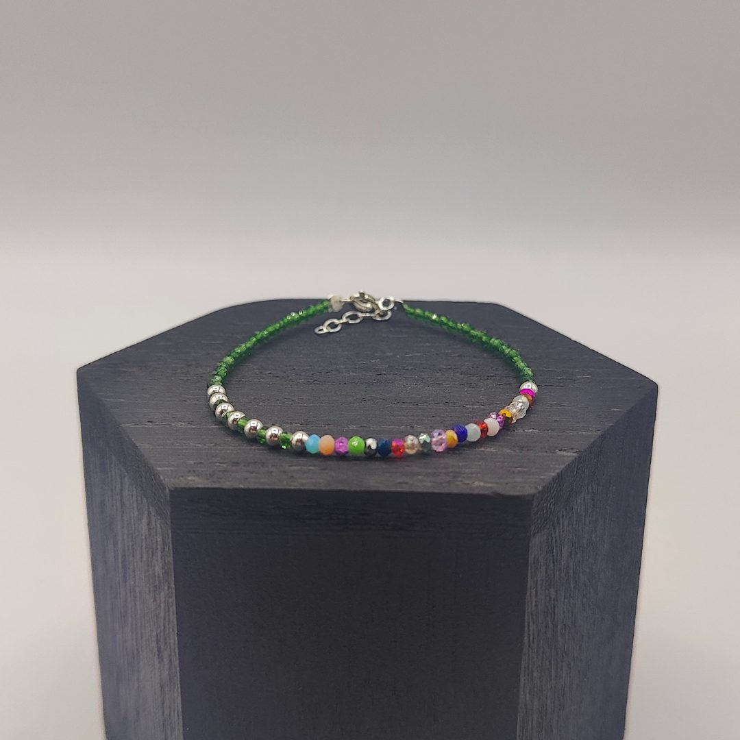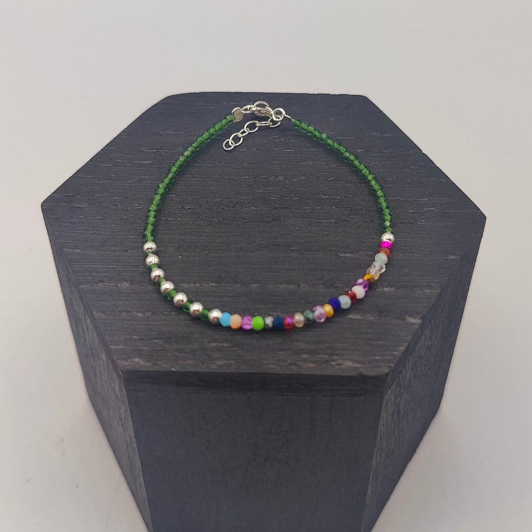 Añade un toque vibrante a tu estilo con esta pulsera de plata de ley 925, adornada con piedrecitas en tonos verdes que enmarcan un encantador centro de piedras de colores.