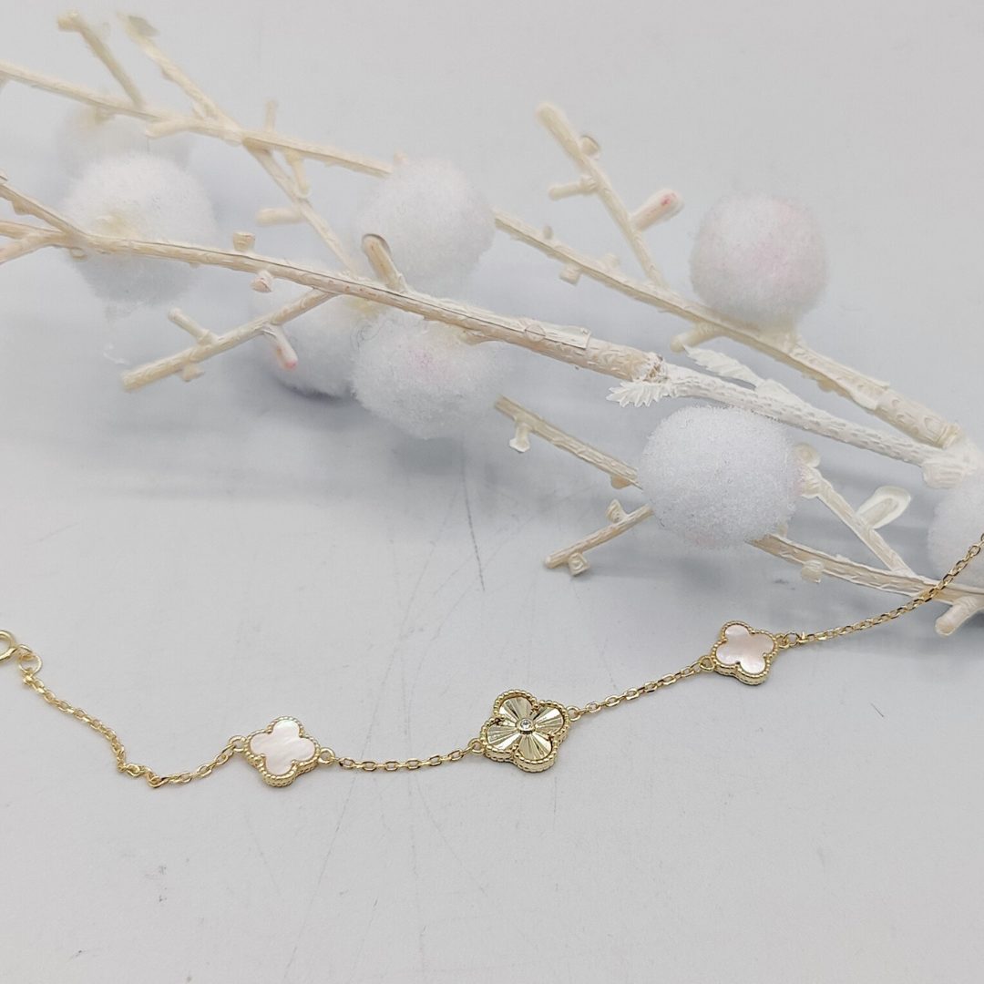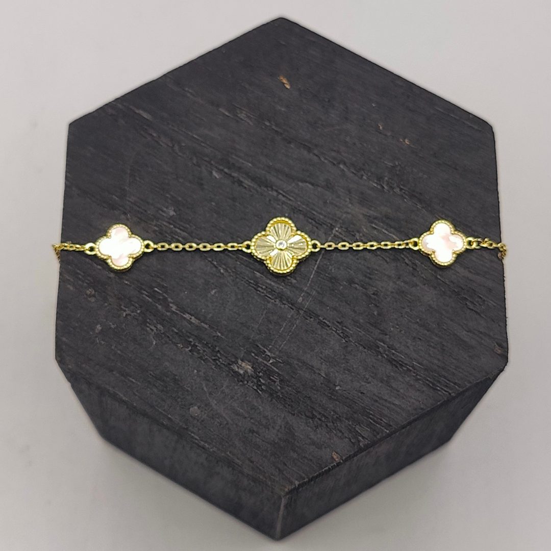 Elegancia y sofisticación se fusionan en esta pulsera de plata de ley 925 bañada en oro, adornada con tres flores inspiradas en el estilo Van Cleef. Dos de las flores cuentan con delicados detalles de nácar.