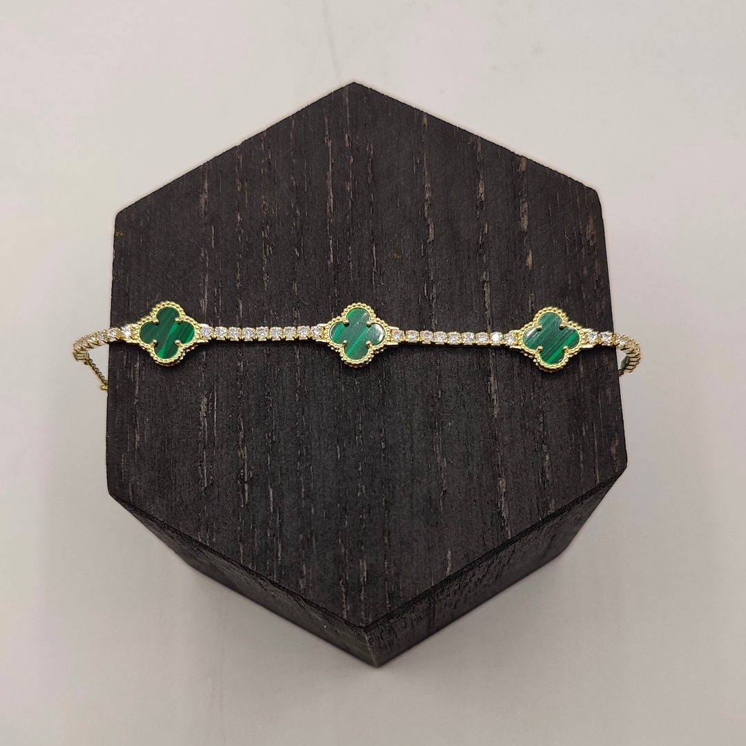 Pulsera de plata dorada estilo riviera con 3 flores malaquita