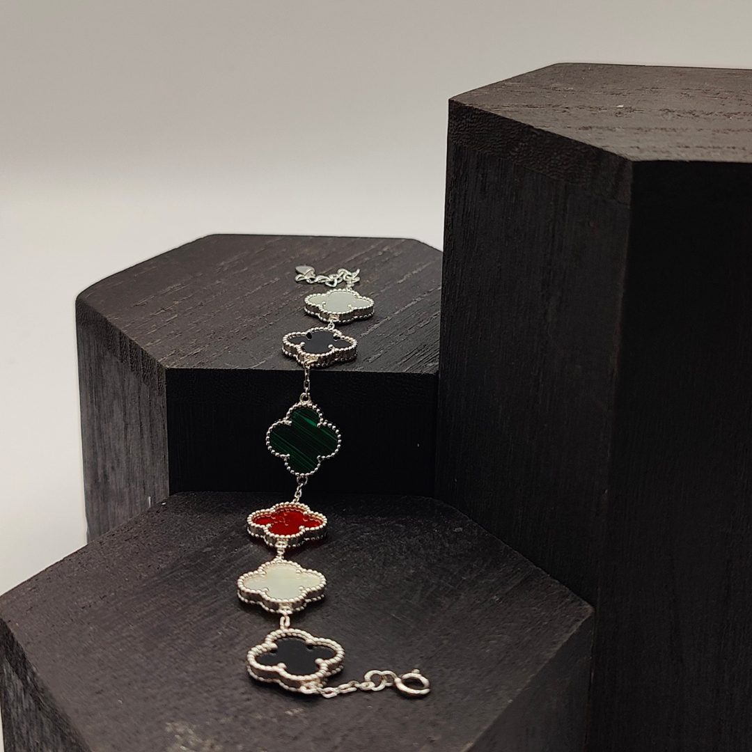 Esta pulsera con flores Van Cleef en plata, adornada con una variedad de piedras preciosas como nácar, malaquita, cornalina y ónix, es una pieza única que combina colores vibrantes y un diseño elegante. Cada flor está cuidadosamente incrustada con piedras que aportan diferentes matices y simbolismos, creando una armonía perfecta entre la naturaleza y la joyería artesanal. Ideal para quienes buscan una joya sofisticada, con un toque de originalidad y distinción. ✨💎🌸