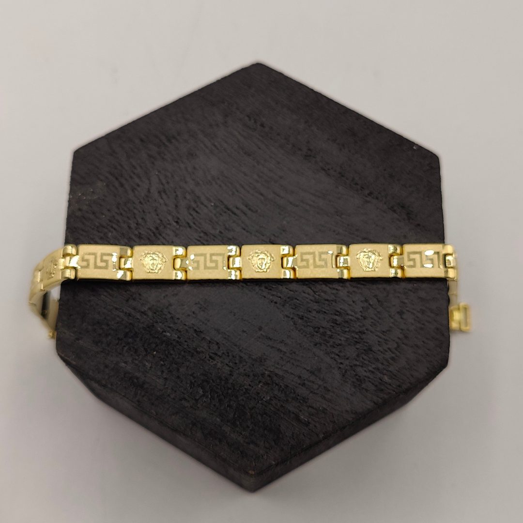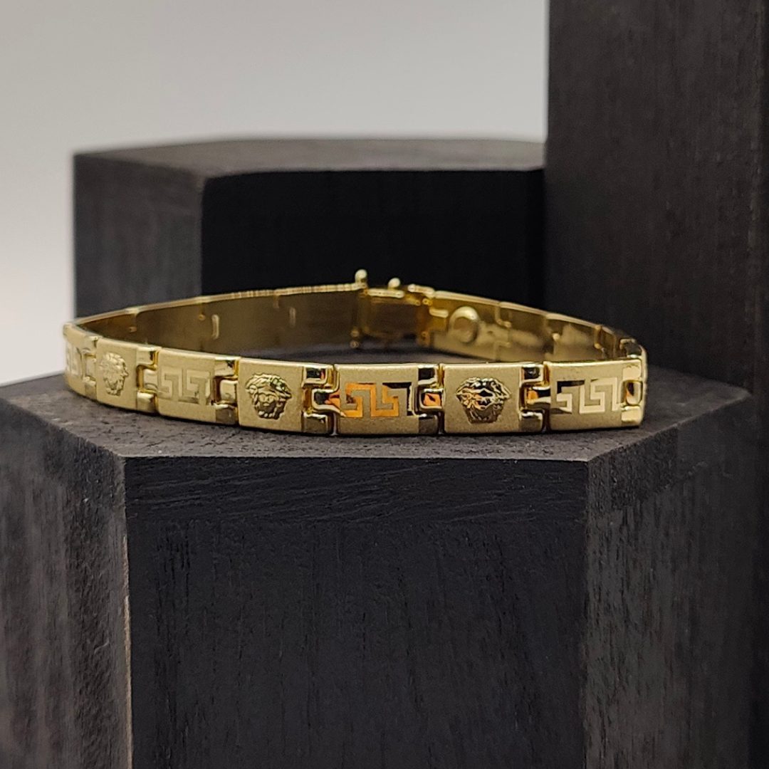 El estilo Versace se refleja en cada eslabón articulado, proporcionando flexibilidad y un ajuste cómodo, mientras que el oro de 18 quilates garantiza durabilidad y un brillo incomparable. Esta pulsera es ideal para complementar cualquier look, desde el más formal hasta el más casual, añadiendo un toque de sofisticación y distinción.