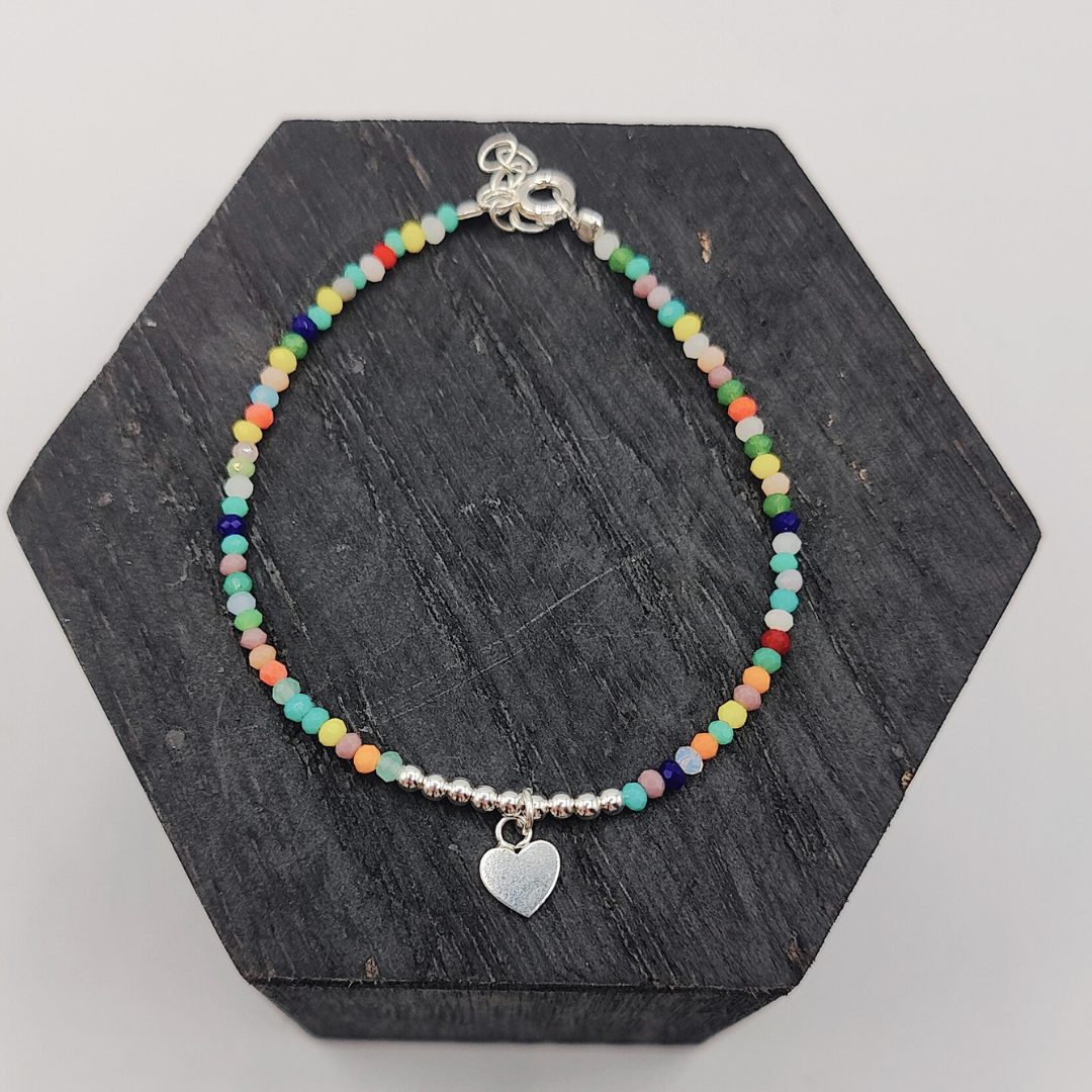 Esta pulsera de plata de ley 925 es una pieza alegre y encantadora, adornada con bolitas de colores que añaden frescura y vitalidad a tu estilo. En el centro, un delicado charm en forma de corazón colgante aporta un toque romántico y simbólico. Perfecta para ocasiones informales o para darle un toque de color a tu look diario, esta pulsera es ideal para quienes buscan una joya llena de significado y energía positiva.