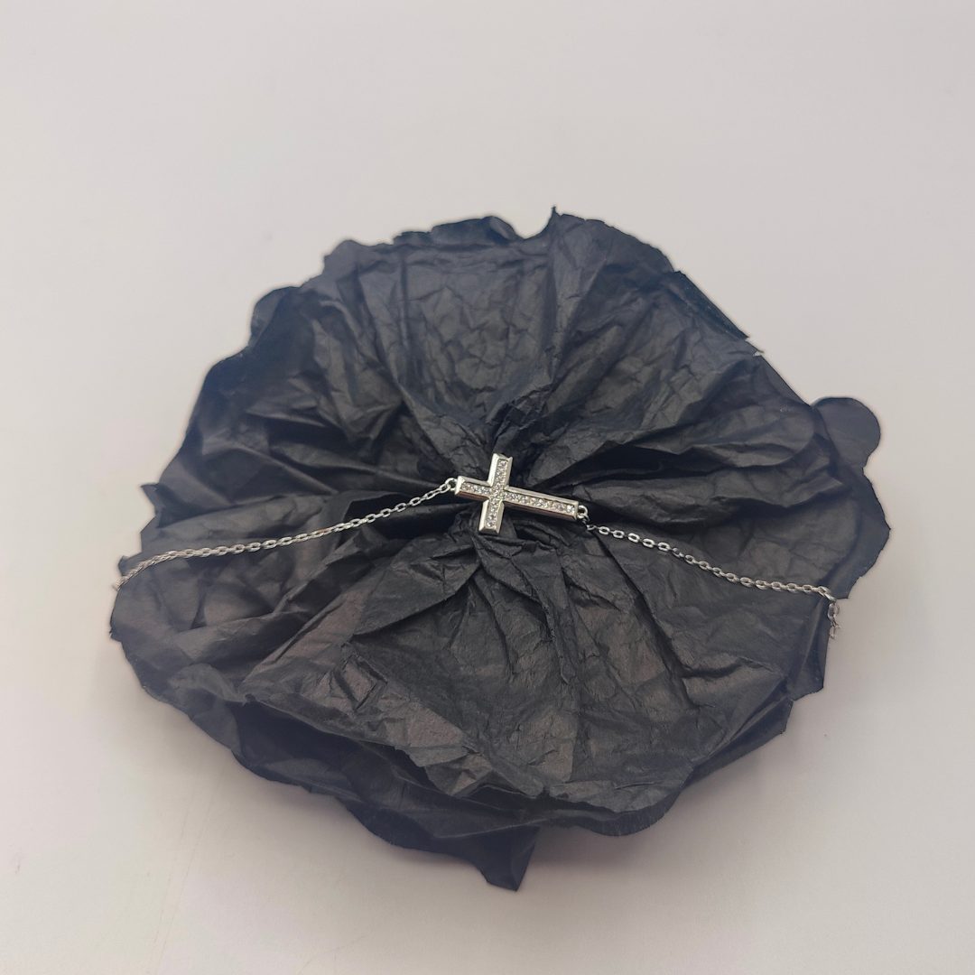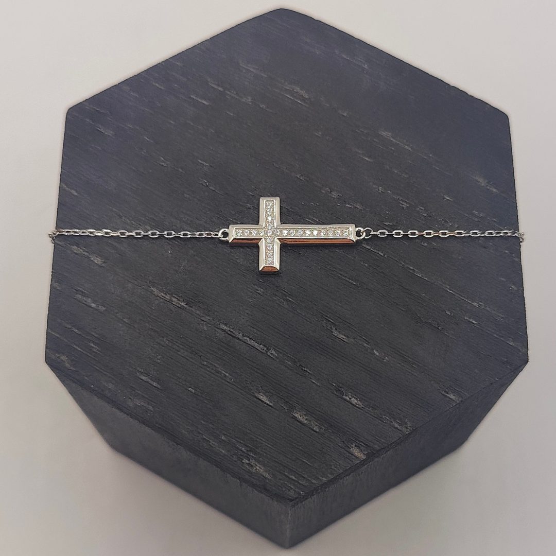 Sutil y con significado, esta pulsera de plata de ley 925 presenta una cruz lateral delicadamente engastada con circonitas que aportan brillo y elegancia.